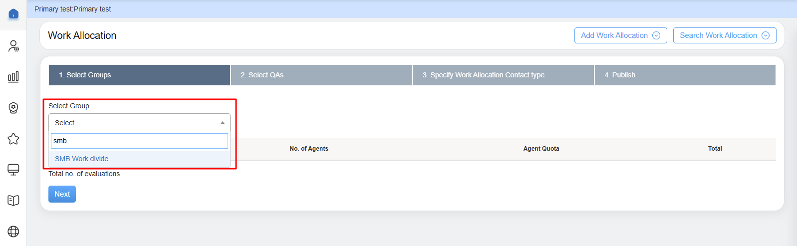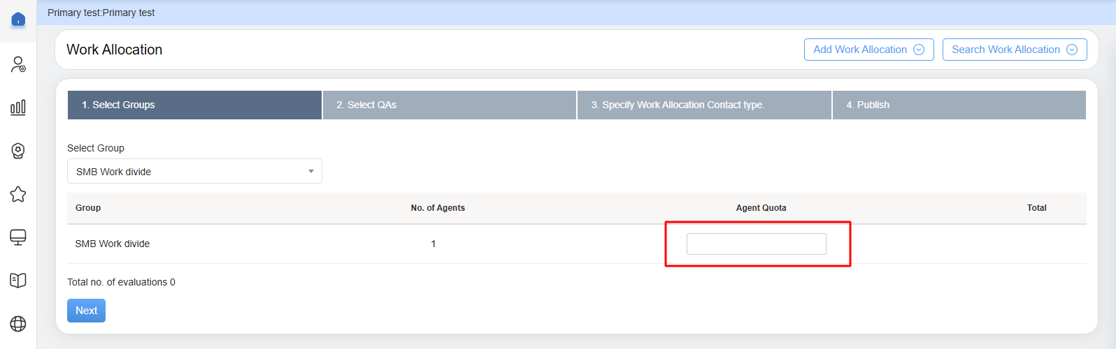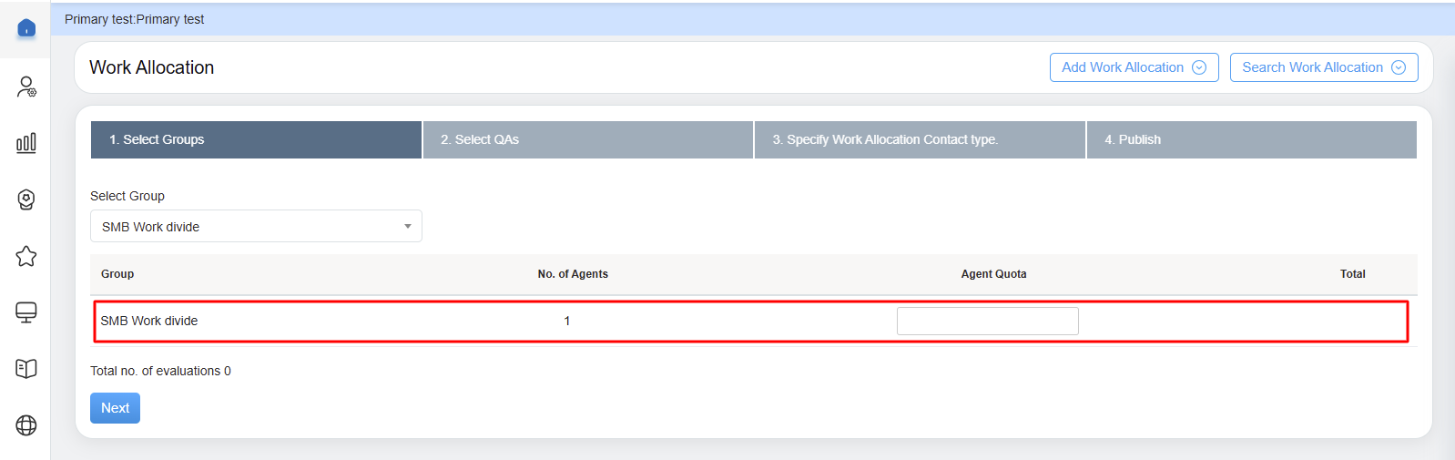 - Total – It displays the total number of evaluations to be performed for the selected work allocation group. For example, If No. of Agents = 5 and Agent Quota = 10, then Total will be equal to 50.