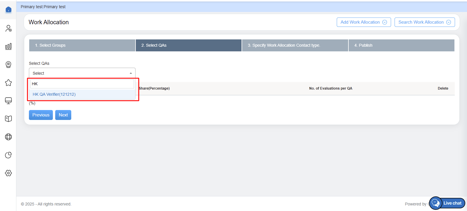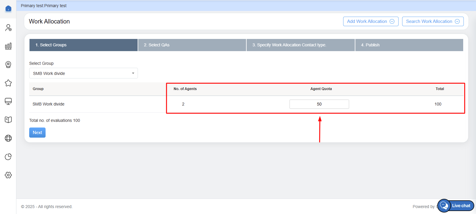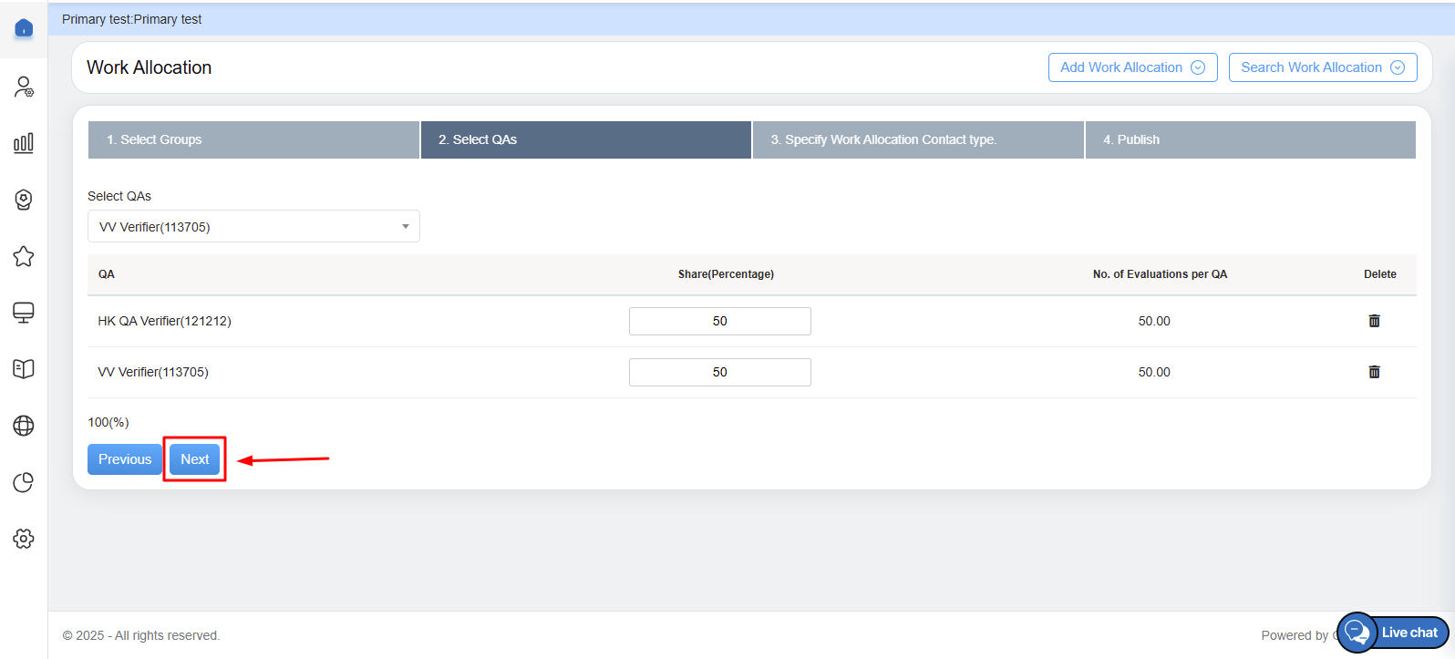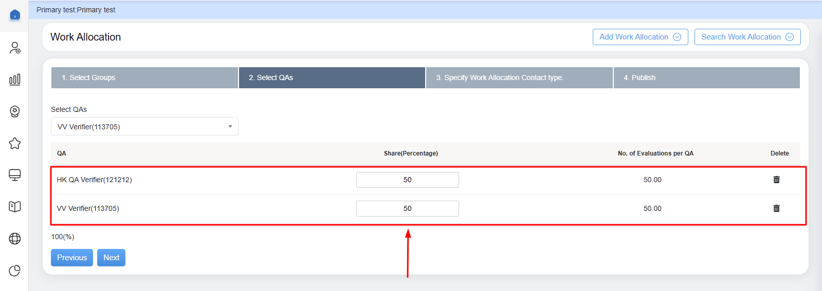 - Similarly, multiple QAs can be selected and their individual share of performing the evaluations can be configured.