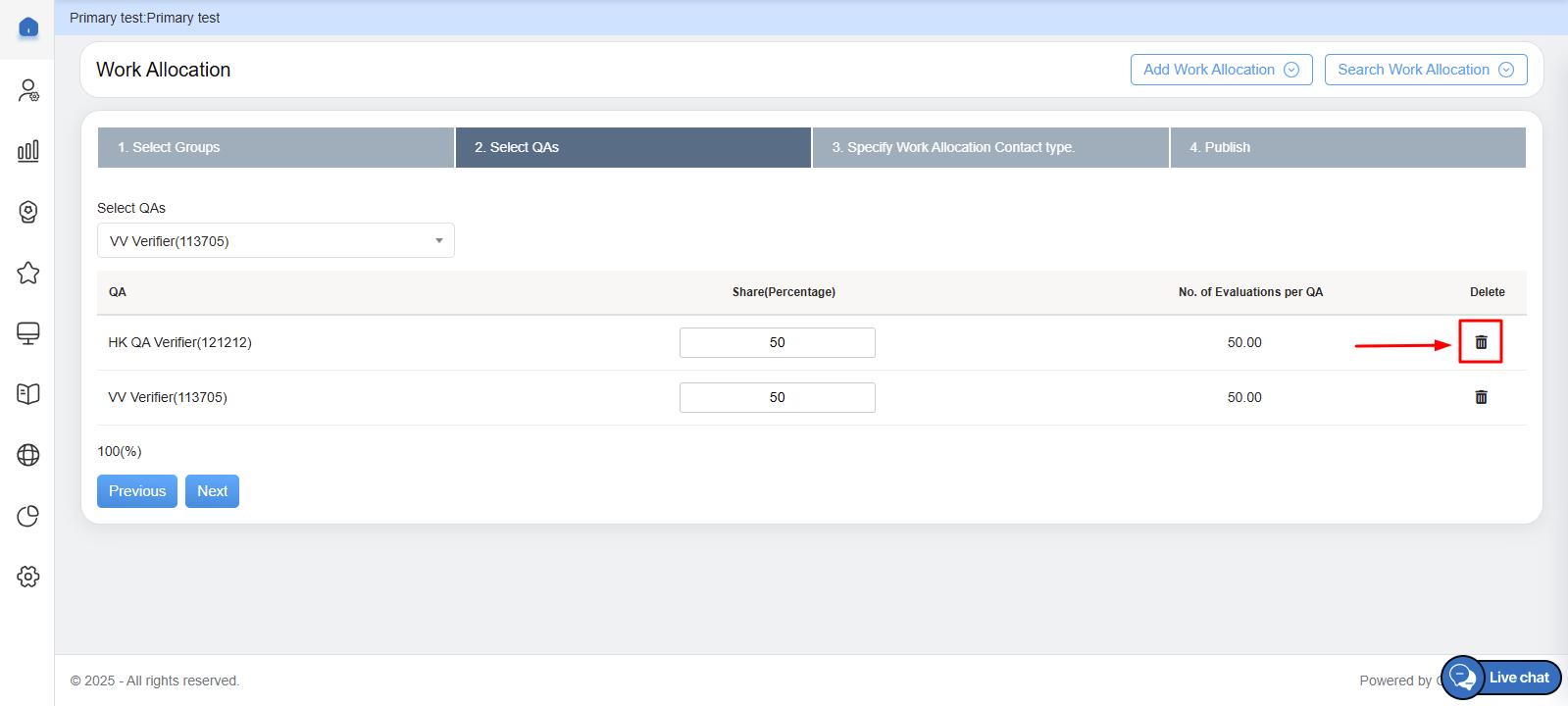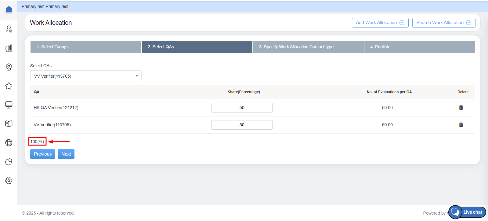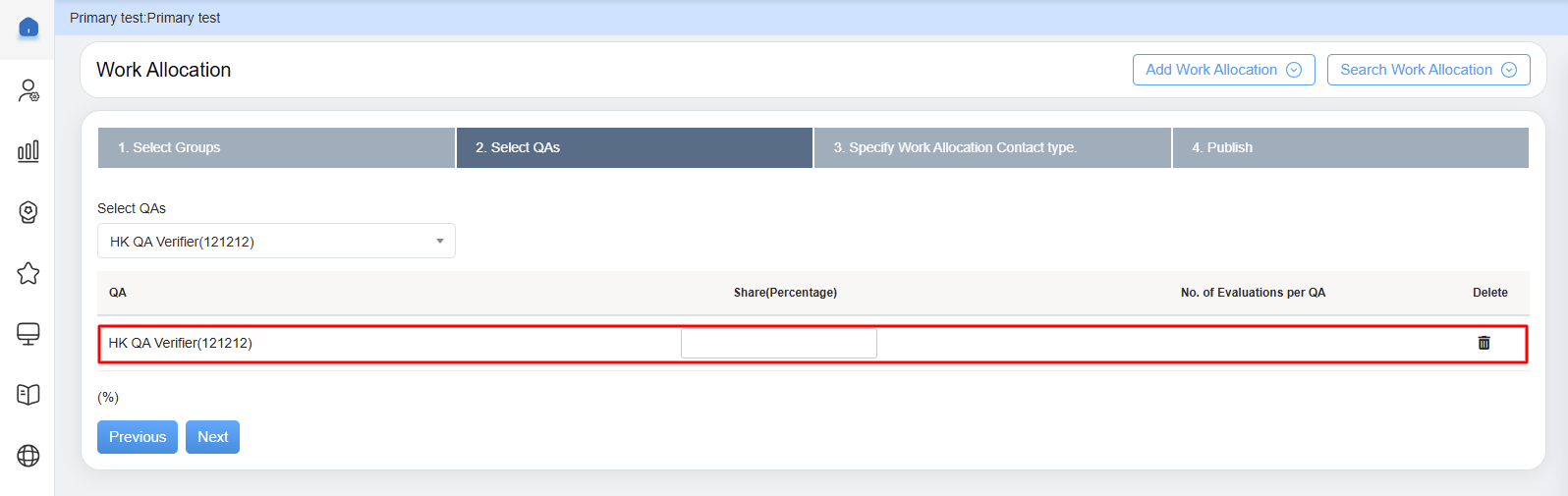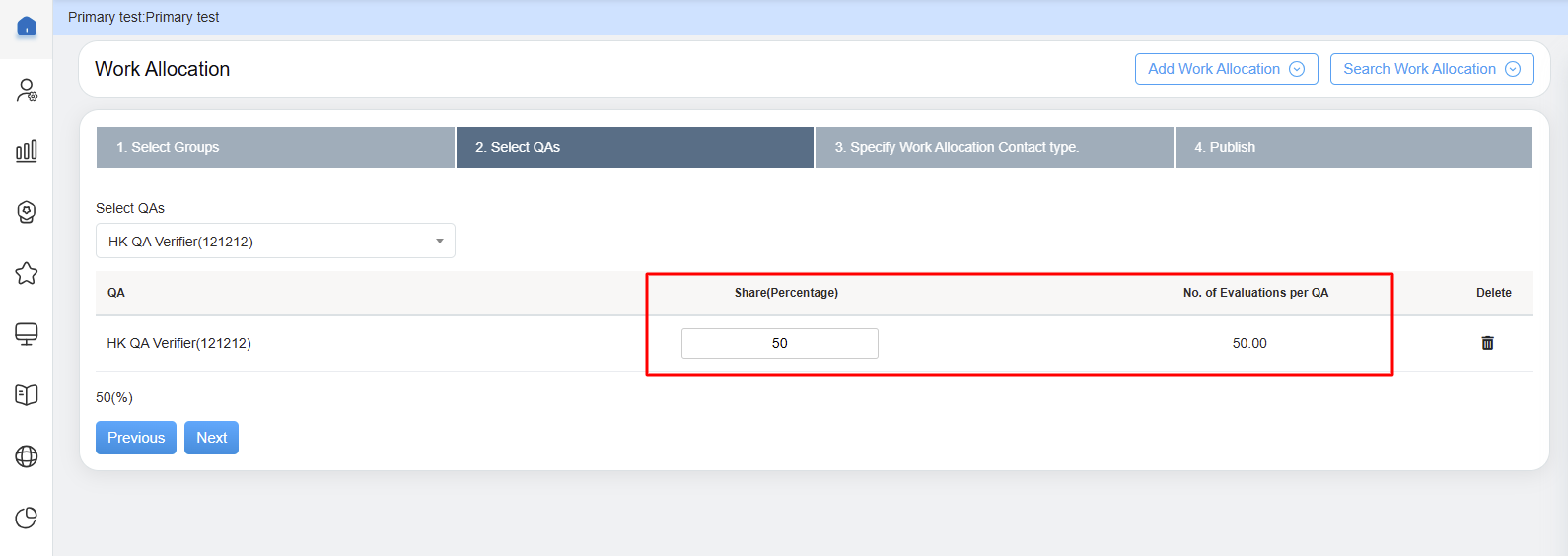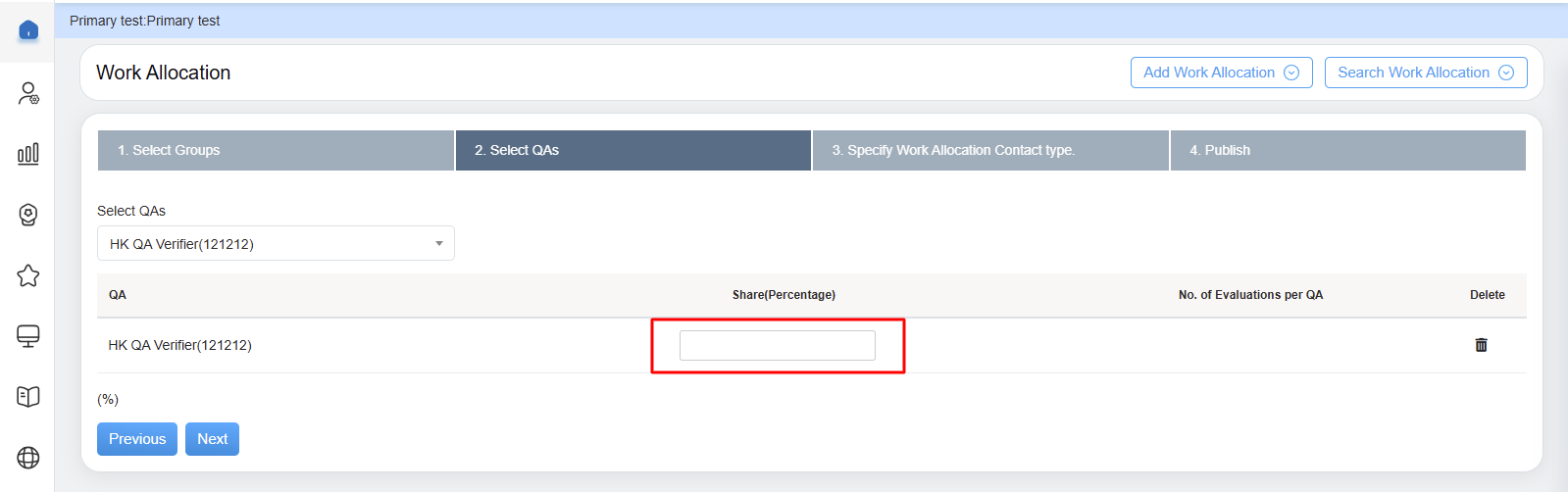 - Share (Percentage) – Enter the share of evaluations to be performed by the selected QA. The value should be entered in percentage in the text box provided under this column.