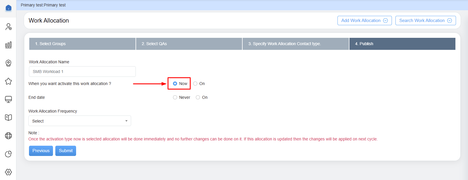 - When you want activate this work allocation – Users can schedule when the work allocation assignment process should be activated once it is published. Select one required option from – Now and On.