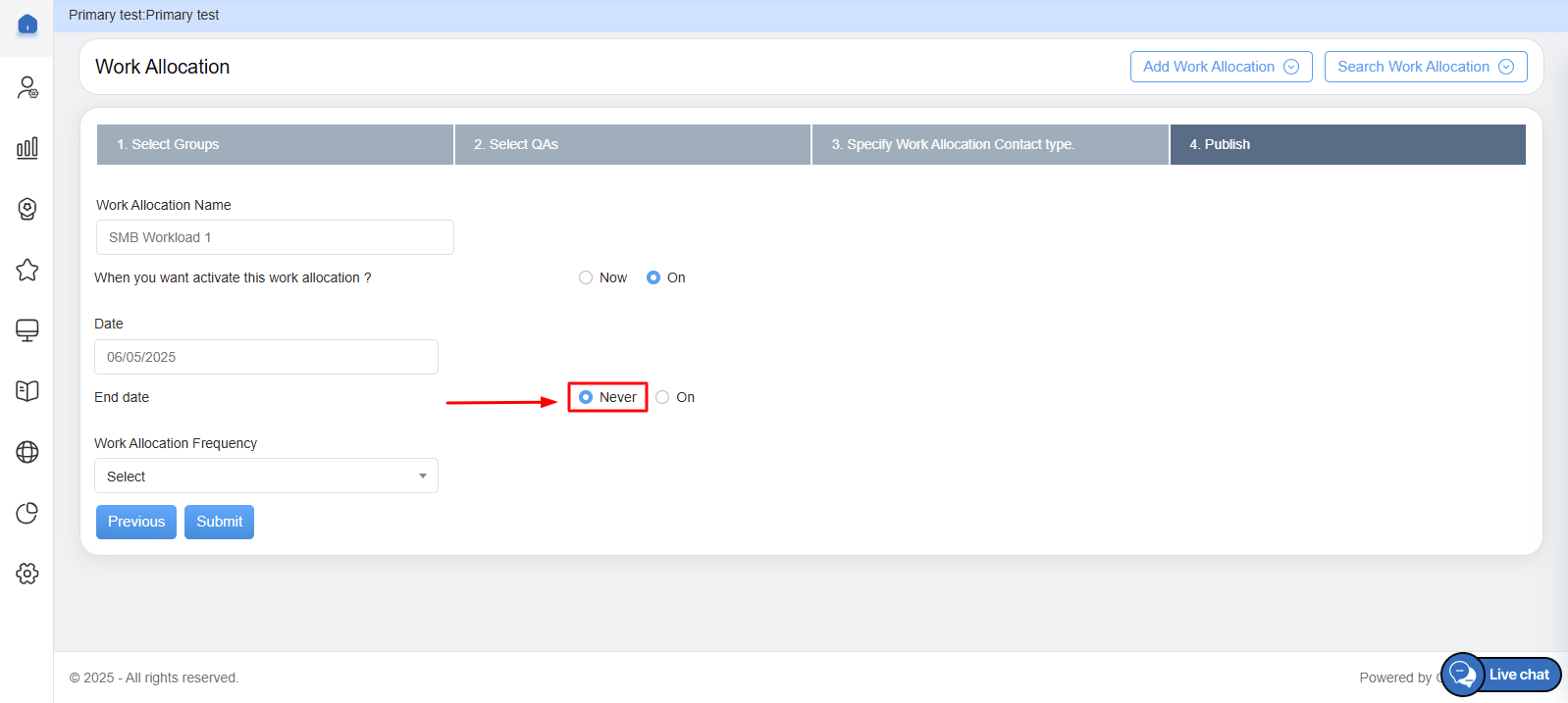 - End Date – Users can schedule when the work allocation assignment process should be deactivated once it is published. Select one required option from – Never and On.