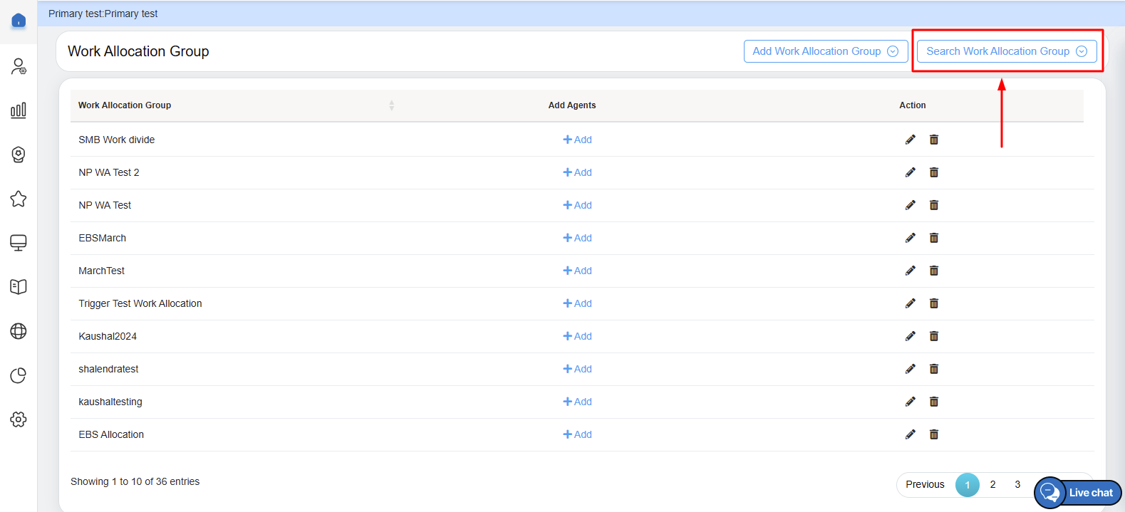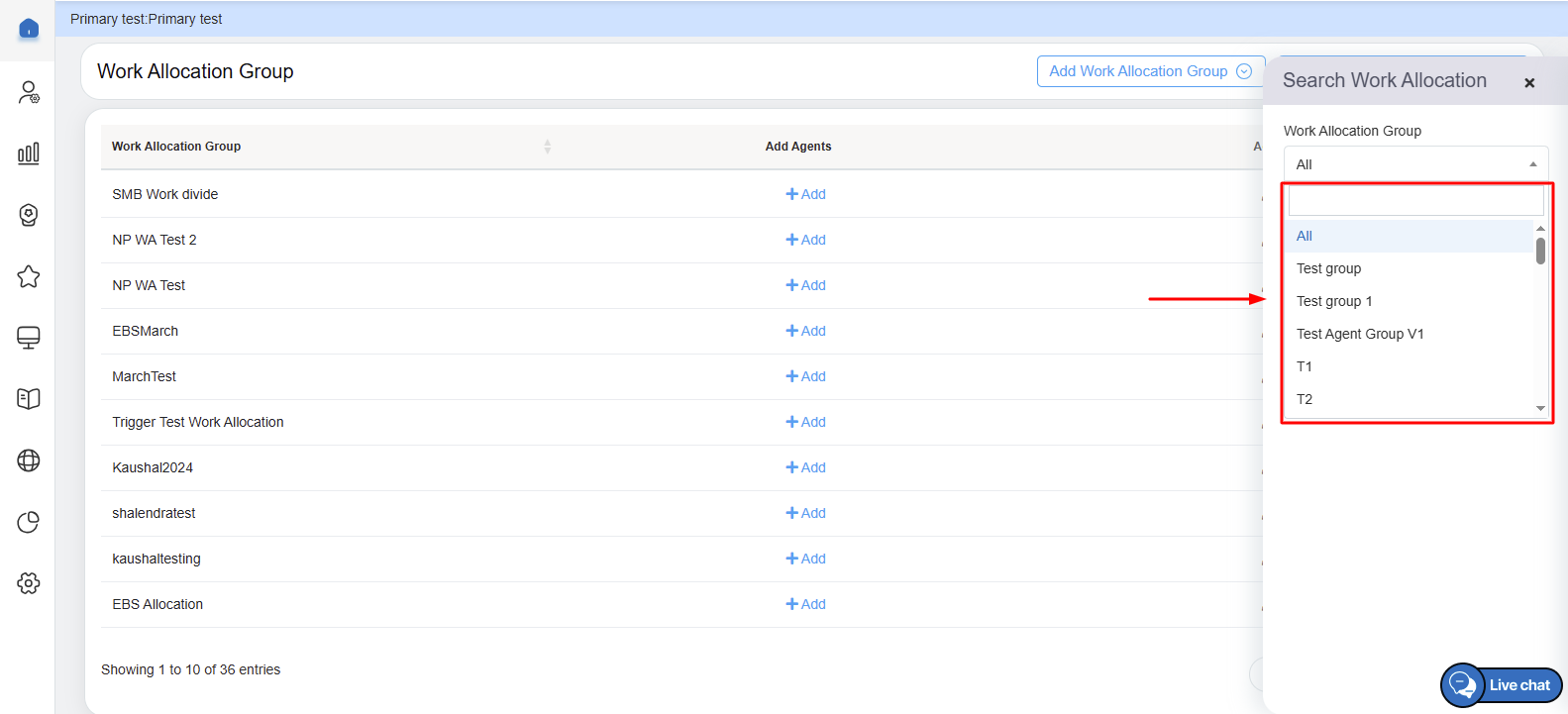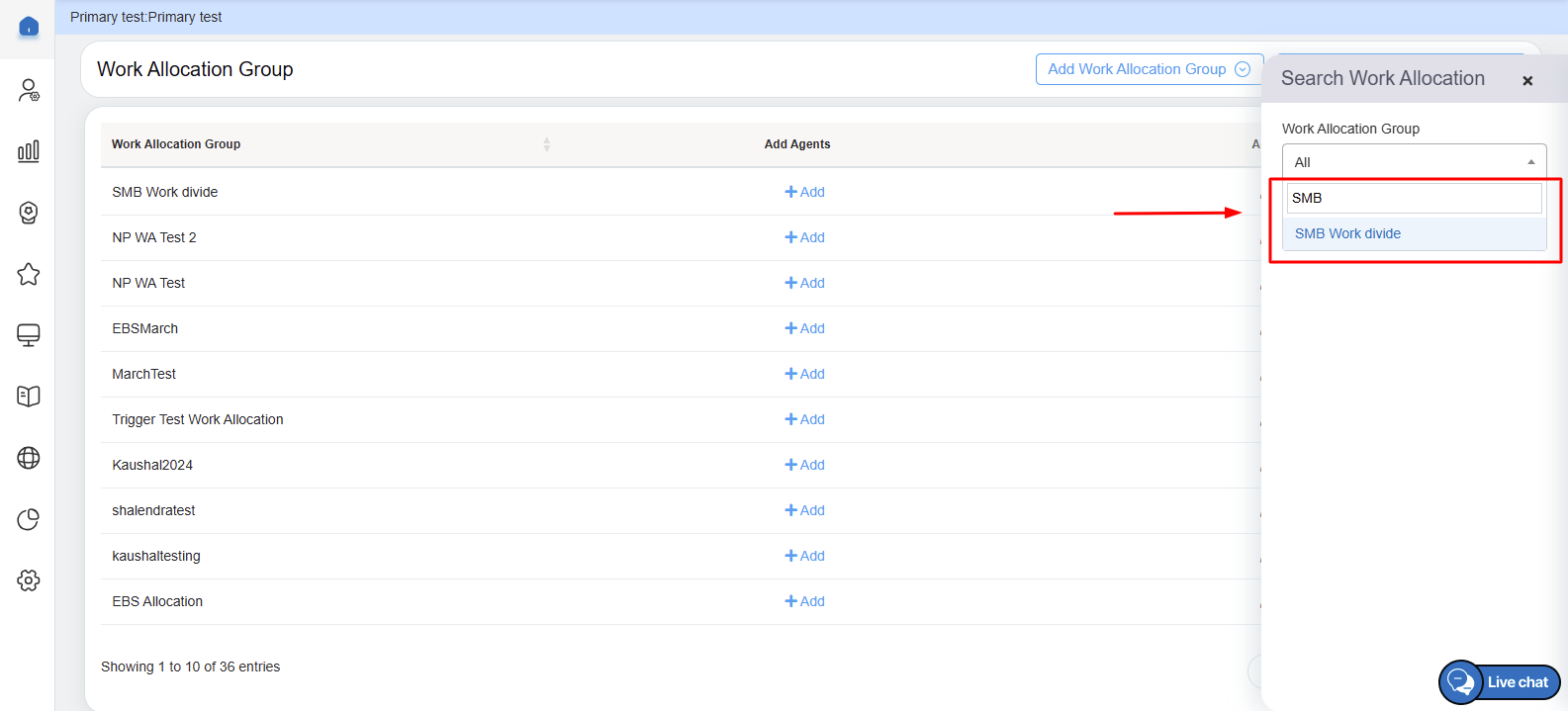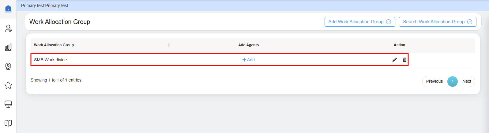Based on the searched group, the list on the Work Allocation Group page will be sorted as shown below: