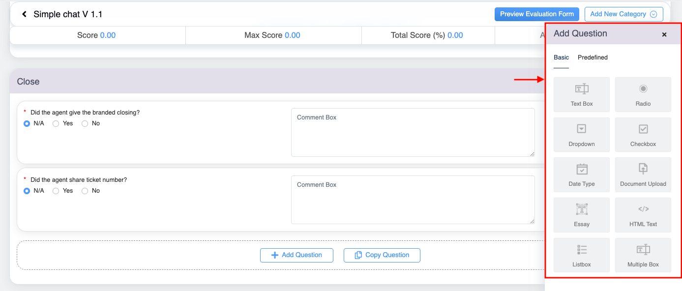 Once the categories are added to the evaluation form, the next step is to add the questions under these newly created or existing categories. The questions can be added by creating new questions from scratch and by copying the question from the existing evaluation form.