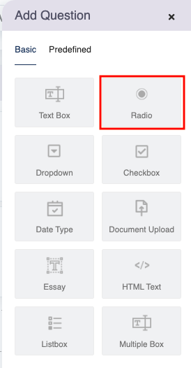 2. Starting with scorable questions from the Basic fields, select any of the field type options displayed on this screen. For instance, select the Radio field type question as shown on the screen below: