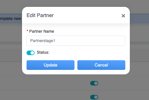 The admin can make changes in the Partner Name and can use the Status toggle to keep the partner active or inactive. Once necessary changes are done, click on the Update button to save changes, else click on the Cancel to discard the process.Then, the acknowledgement message will be displayed as shown below: