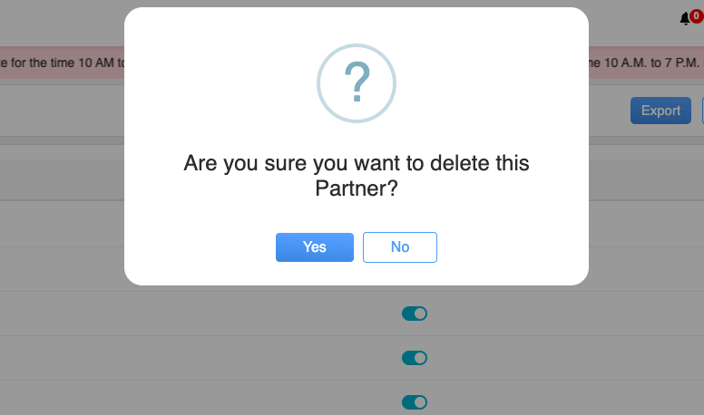 A confirmation message will be displayed. Click on the Yes button to inactive the specific partner, else click on No button to discard the process as shown below: