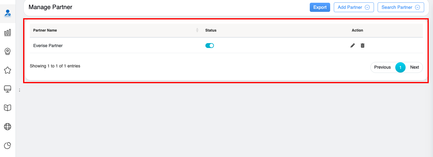 Once the necessary details are configured, click on the Search button to search the details of specific or all partners, else click on Reset to reset the fields. Based on the search criteria the search results will be displayed on the Manage Partner page.