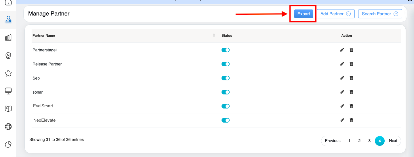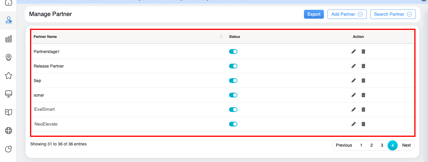 Admin can manage the active/inactive status of any partner using the Toggle button displayed under the Status column. The page also allows an admin to edit or delete the details of the specific partner.