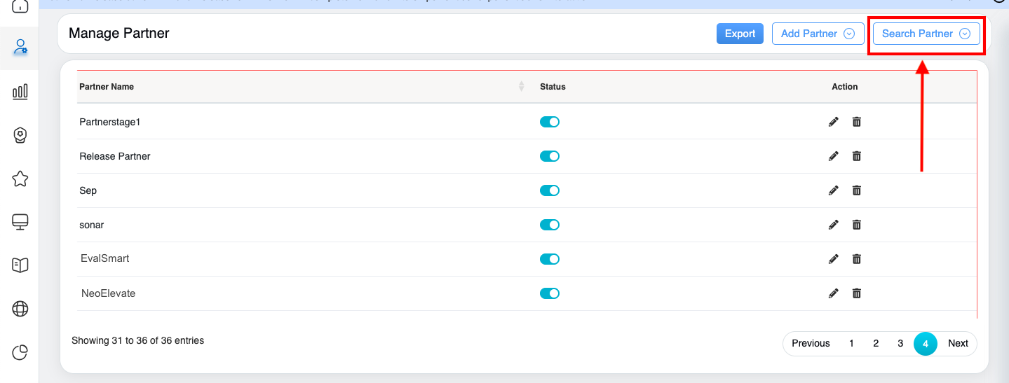 QEval provides the platform to include partners of the clients in the system. This page allows an admin to manage all the partners of the organization. An admin can also add and search a partner on this page.