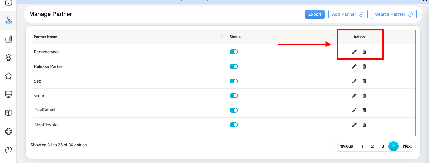 icon displayed under the Action column to edit a specific partner detail as shown below: