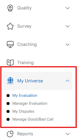 The My Universe category in QEval allows users to view their evaluation results. This section also helps them to manage good/bad calls. An agent specifically also has the option to raise a dispute for a particular evaluation if s/he has any concerns on the same.
