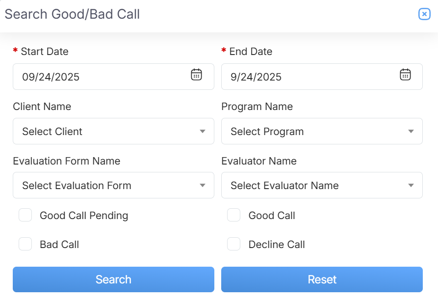 button. The list on the Search Good/Bad Call page will display the calls based on the set filters.