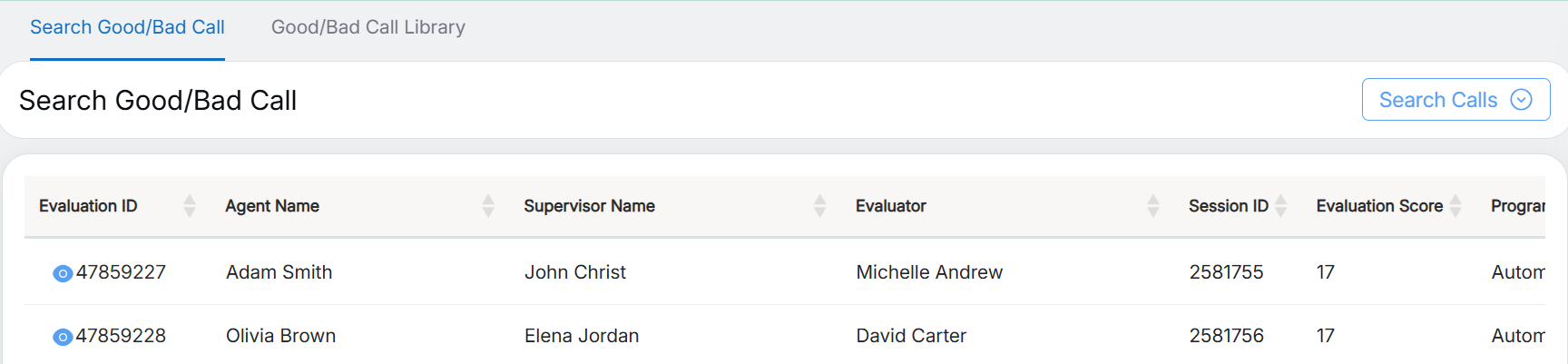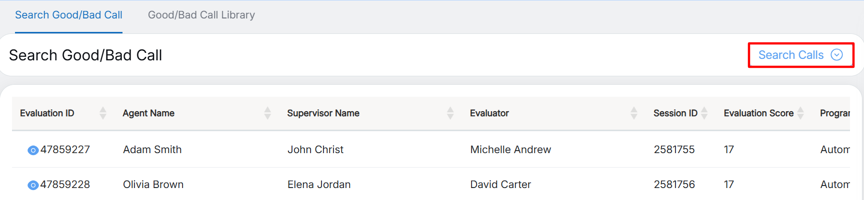 The list of evaluated calls will be displayed on this screen with the following details: