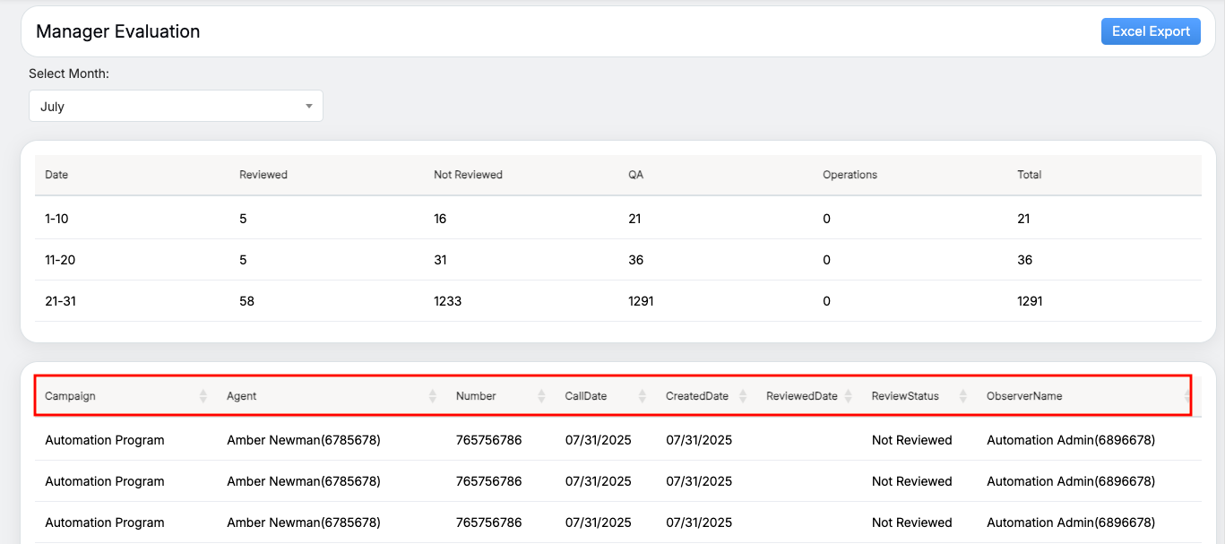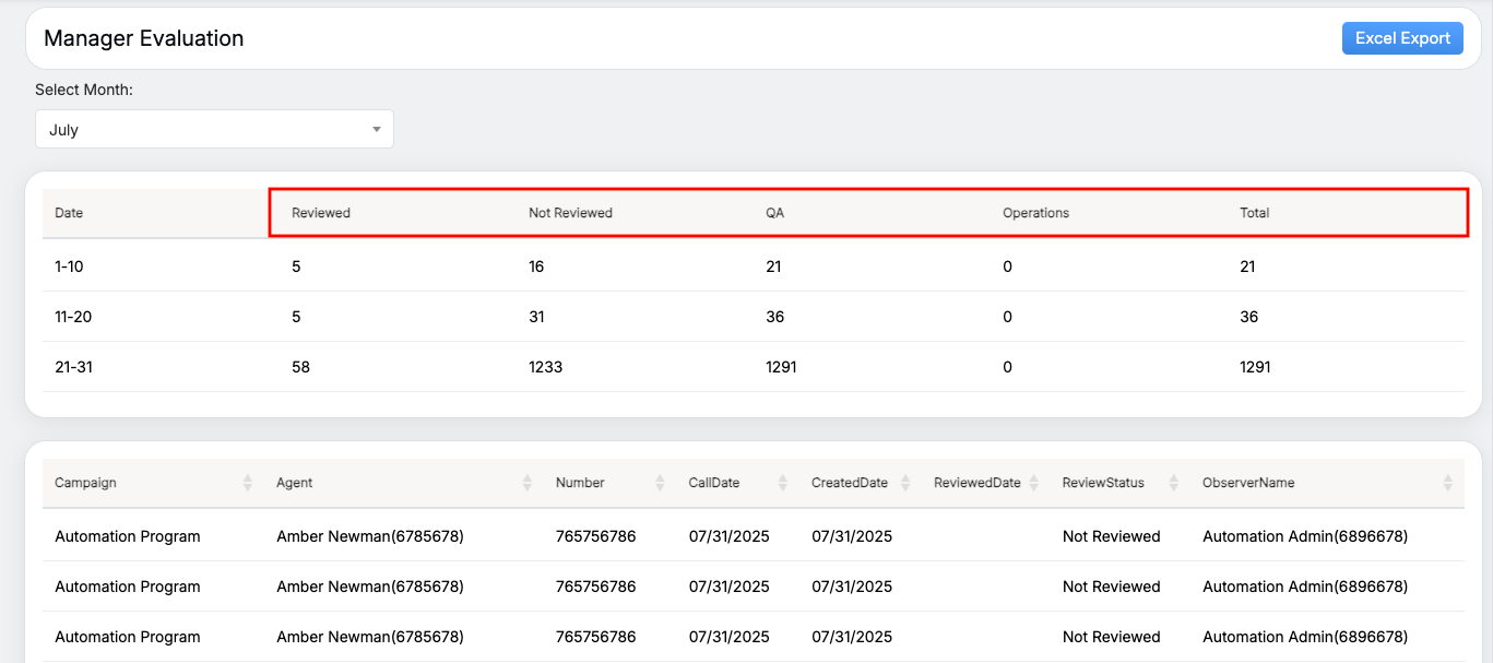 One can also view the details of the evaluations by clicking on the respective status column headers – Review, Not Reviewed, QA, Operations and Total.
