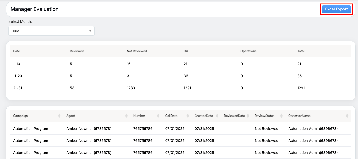 The Manager Evaluation page displays a summary of all the evaluations of agents under the particular manager.