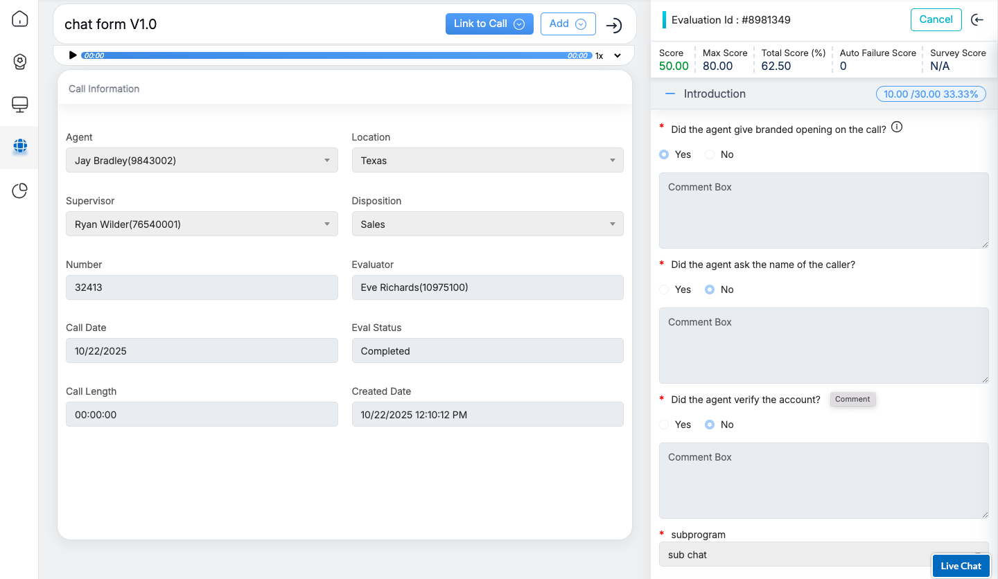 Agents and supervisors have the ability to review evaluation forms and raise disputes by navigating to the Review/Dispute Information section located at the end of the form. This section enables agents to provide their evaluation status and supervisors to address disputes. Once both agents and supervisors have submitted their inputs, the QA Supervisor can review the details and provide final feedback by either accepting or declining the dispute.