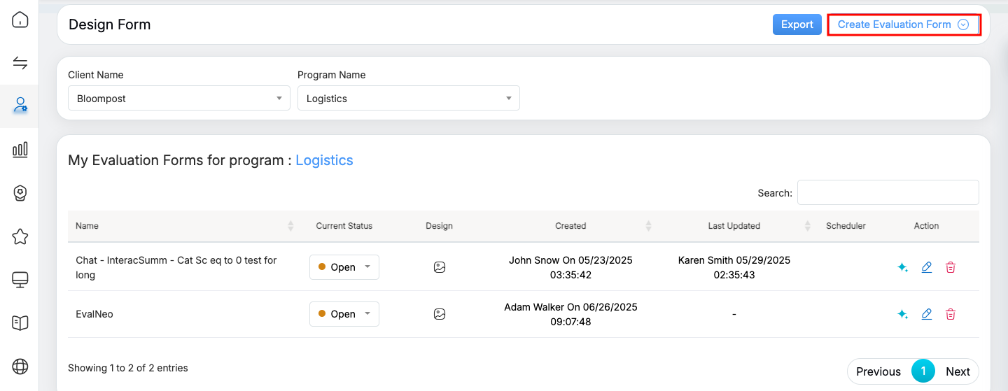 - To create a new evaluation form, click on the Create Evaluation Form button.