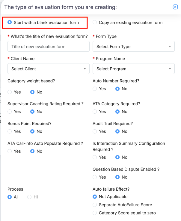 - Select the Start with a Blank Evaluation Form option and the following screen appears.