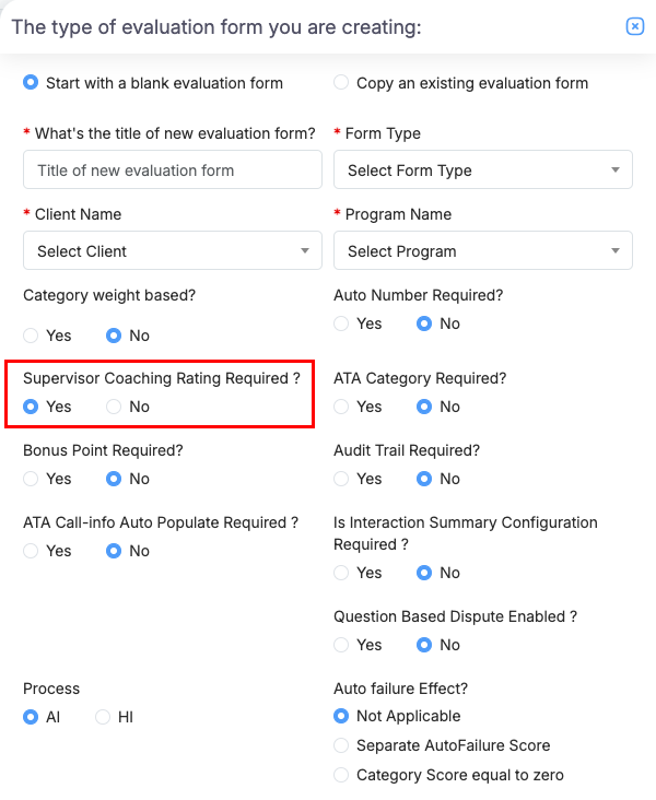 - Along with the other configurations, select the Yes radio button for the Supervisor Coaching Rating Required? field as shown below: