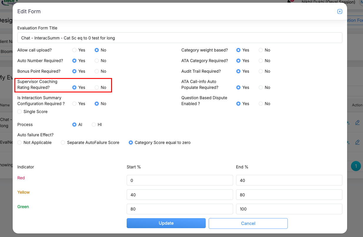 - Along with the other configurations, select Yes radio button for the Supervisor Coaching Rating Required? field as shown below: