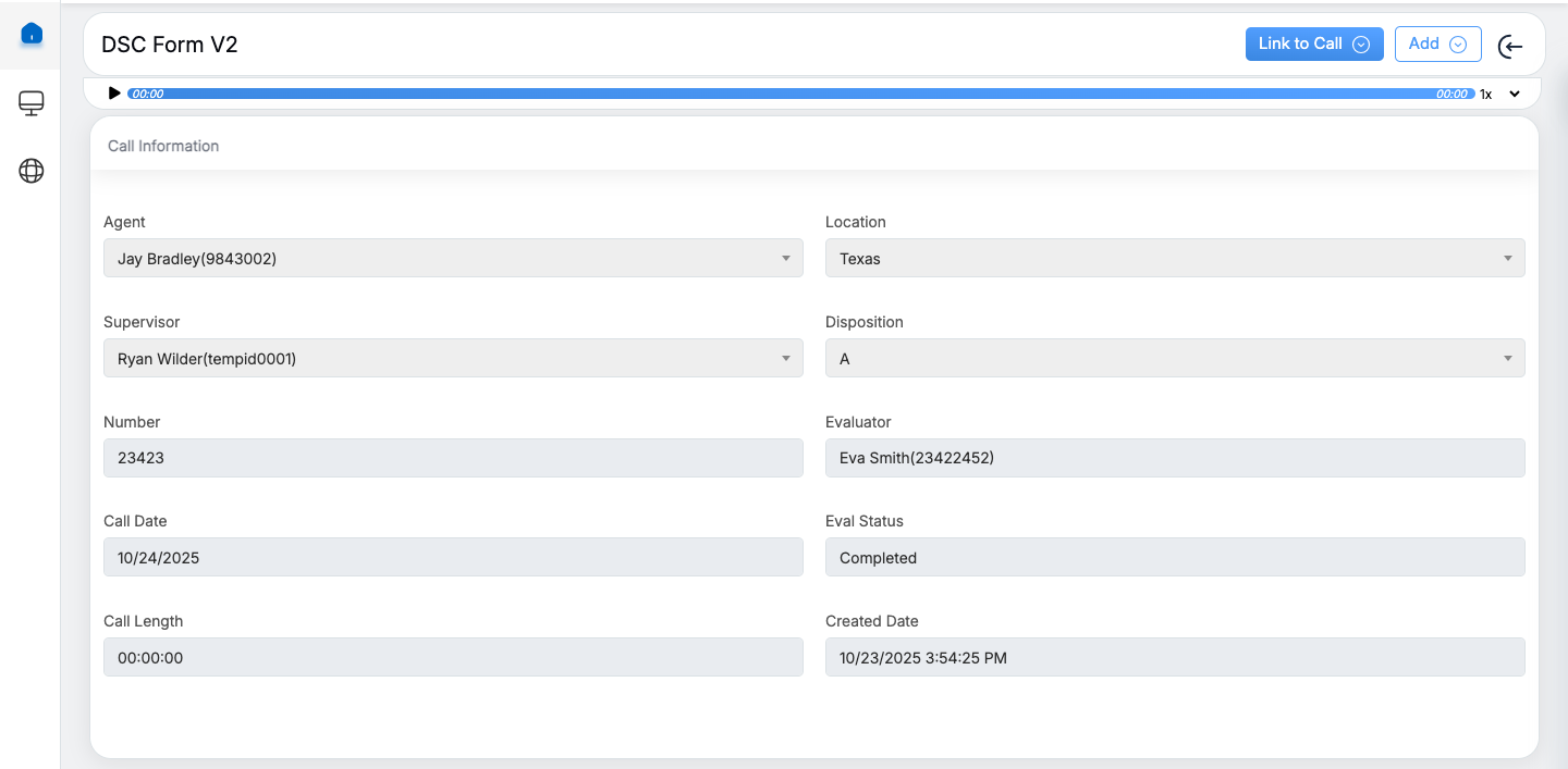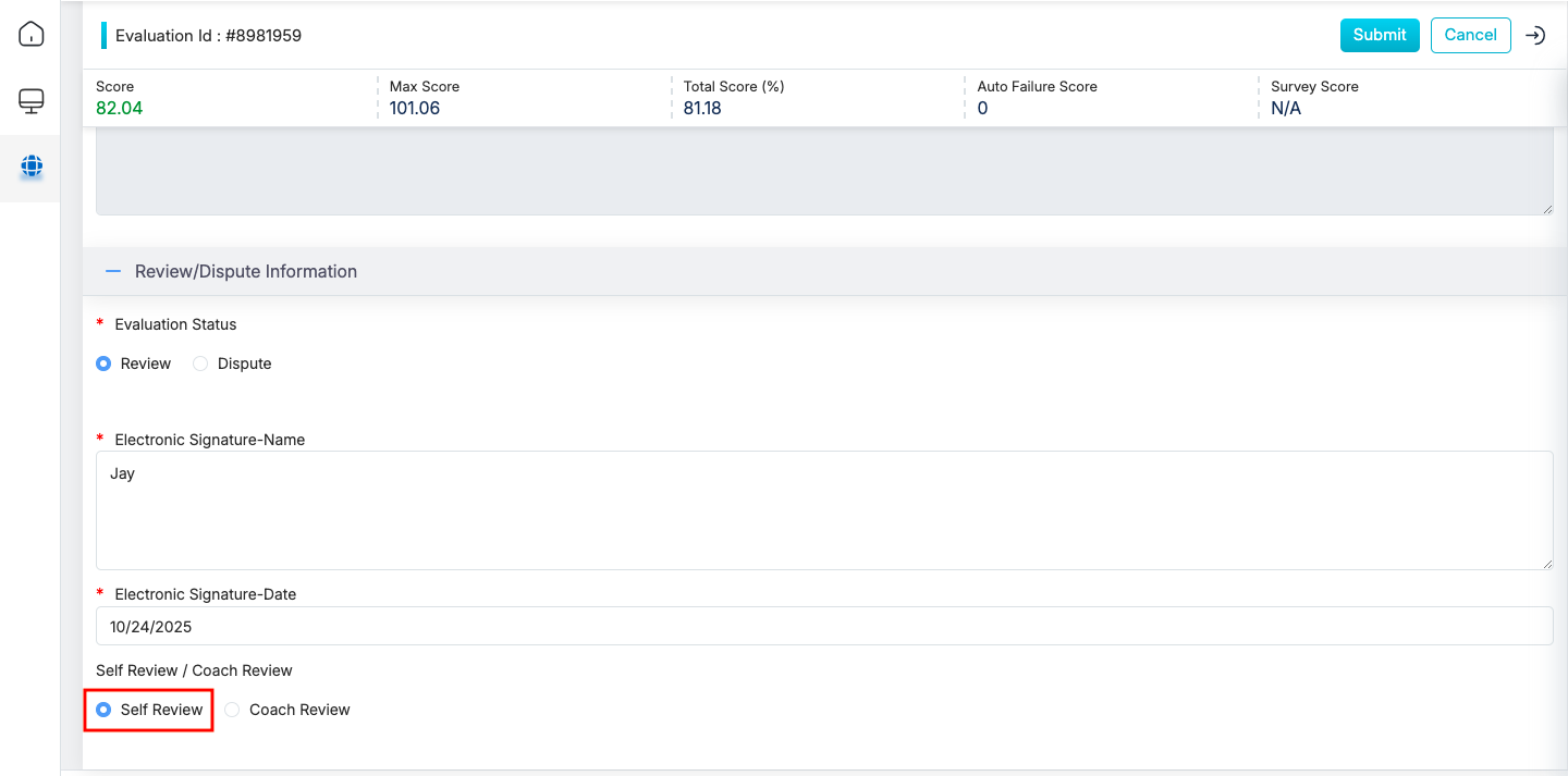 If the supervisor has not provided any coaching, then the agents have to click on the Self Review radio button for the field Self Review/Coach Review and submit the evaluation.