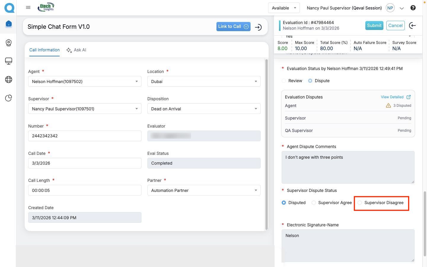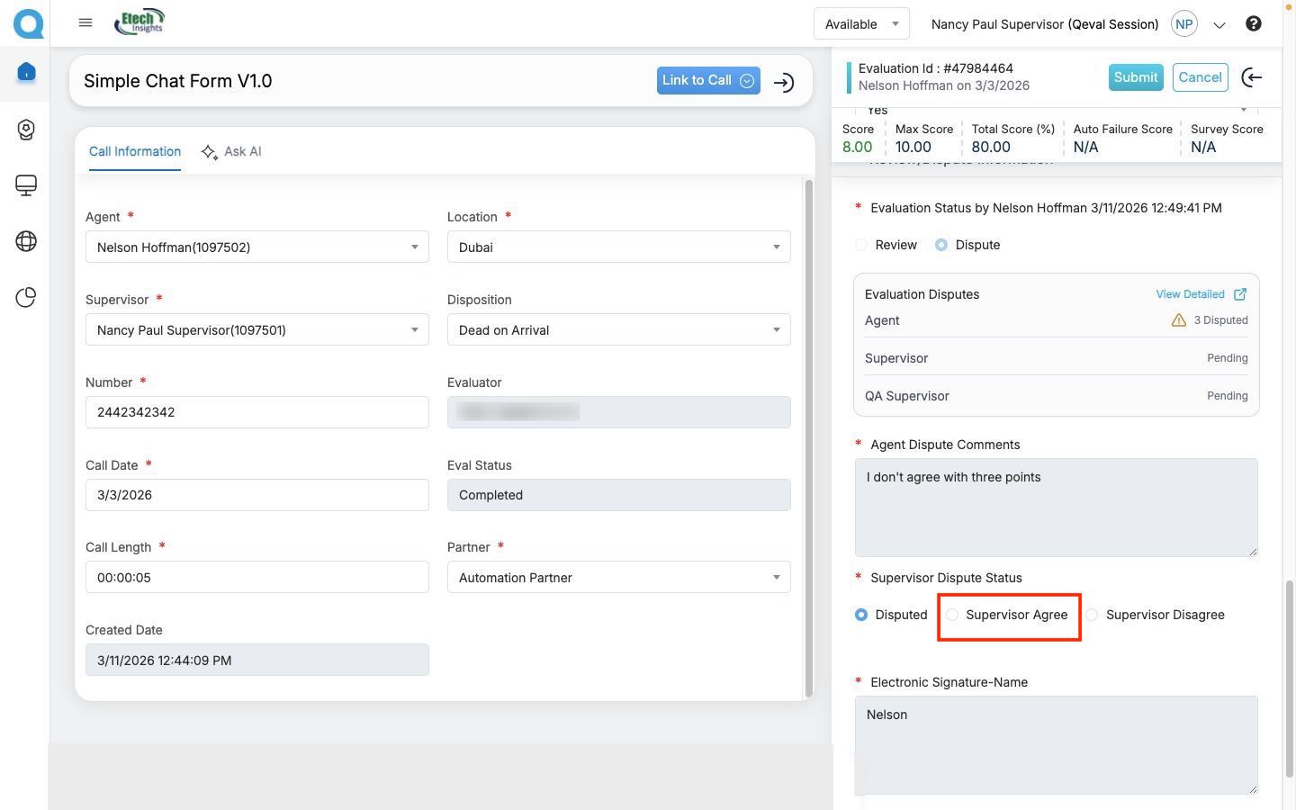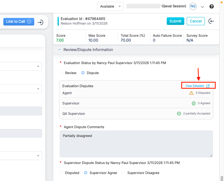 When an Agent raises a dispute on specific questions within an evaluation, the dispute is captured at the parameter level and then forwarded to the Supervisor for review.Â