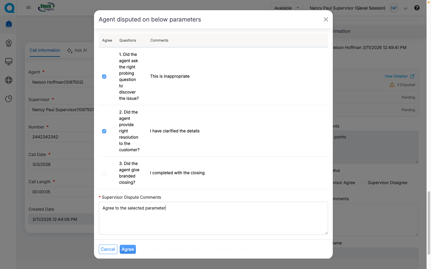 In this pop-up, the QA Supervisor can review the parameters, select the relevant checkboxes for the ones they want to approve, enter QA Supervisor dispute comments, and then click Agree followed by Submit to complete the action.
