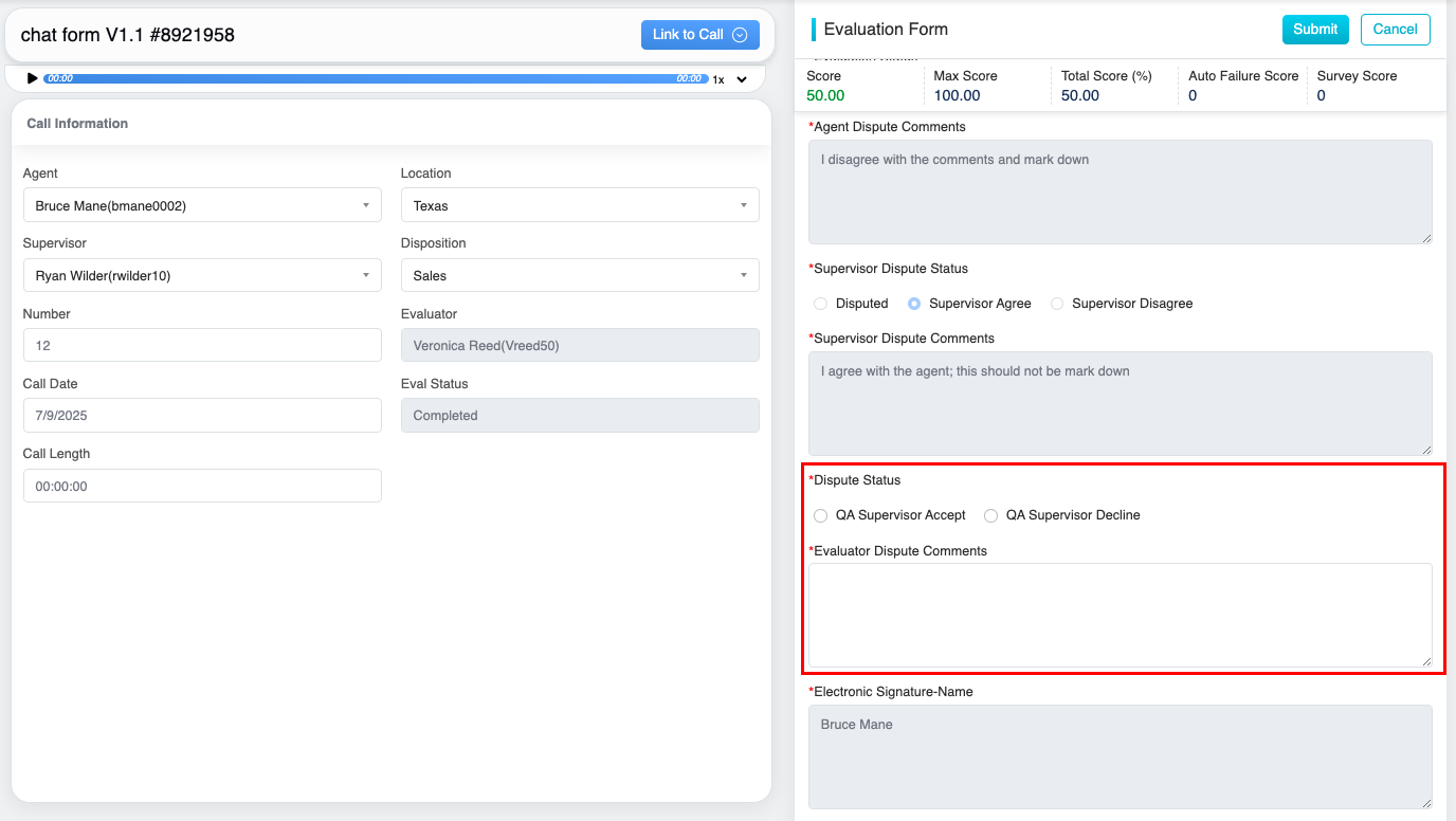 The QA Supervisor View enables QA supervisors to review disputes submitted by agents and supervisors. It allows the QA supervisor to finalize the dispute resolution by selecting an appropriate Dispute Status (e.g., QA Supervisor Accept or QA Supervisor Decline) and providing evaluator comments in the designated field. The system automatically populates the Electronic Signature Name and Date fields to ensure record authenticity.