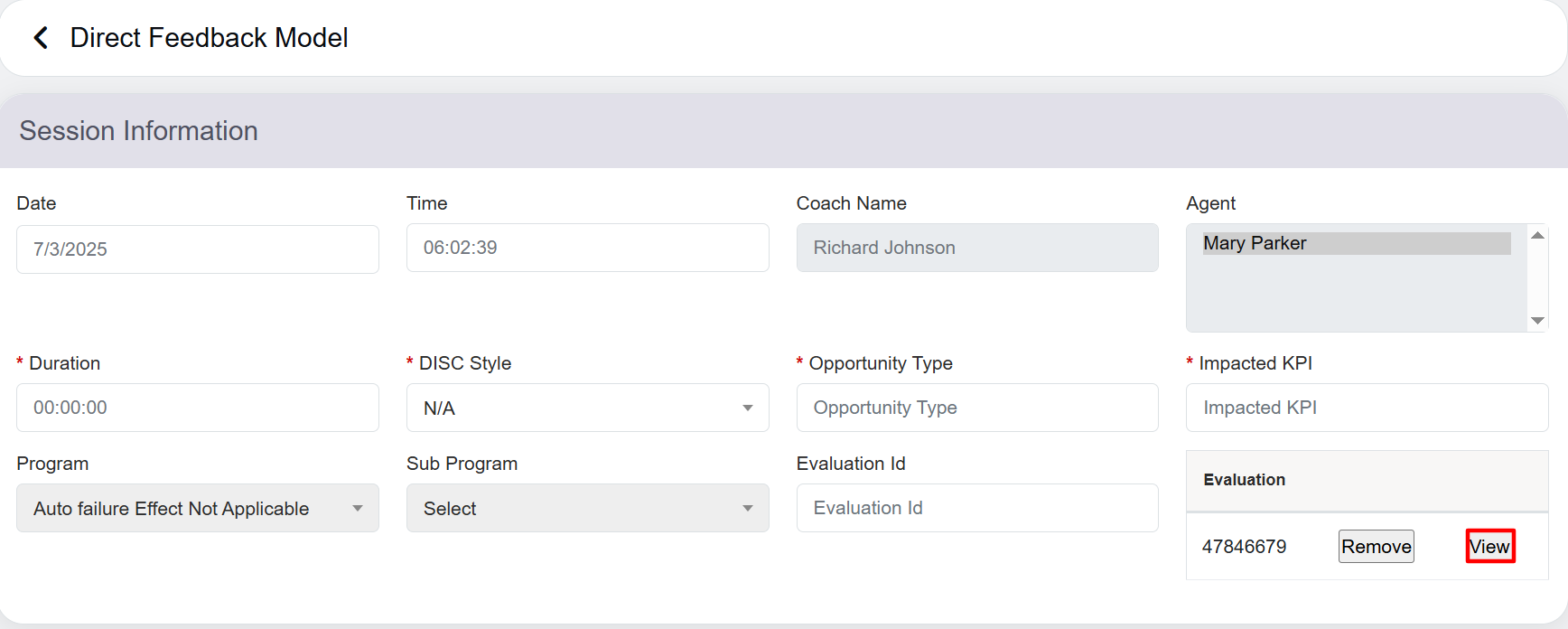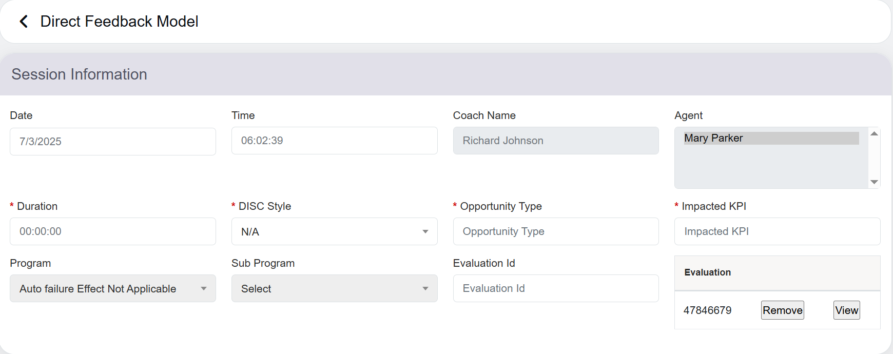 To remove any evaluation form, for which the coaching need not to be added, click on the Remove button against the evaluation ID displayed under the Evaluation section as shown below: