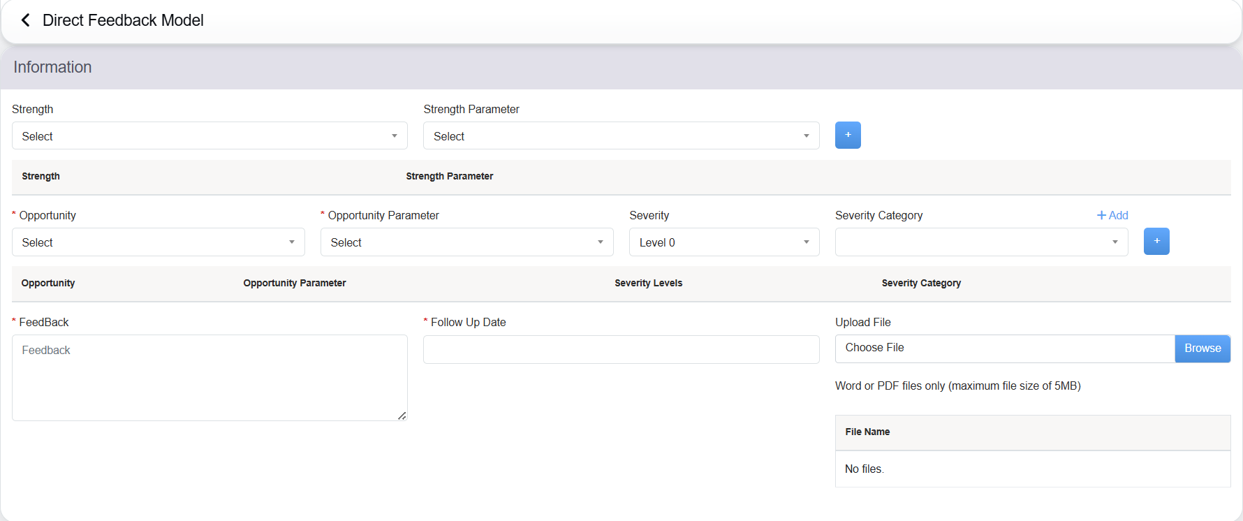 • The user will be redirected to the Direct Feedback Model page, where the authorized user can add feedback along with the other details of all the selected evaluation(s) based on the strengths and opportunities.