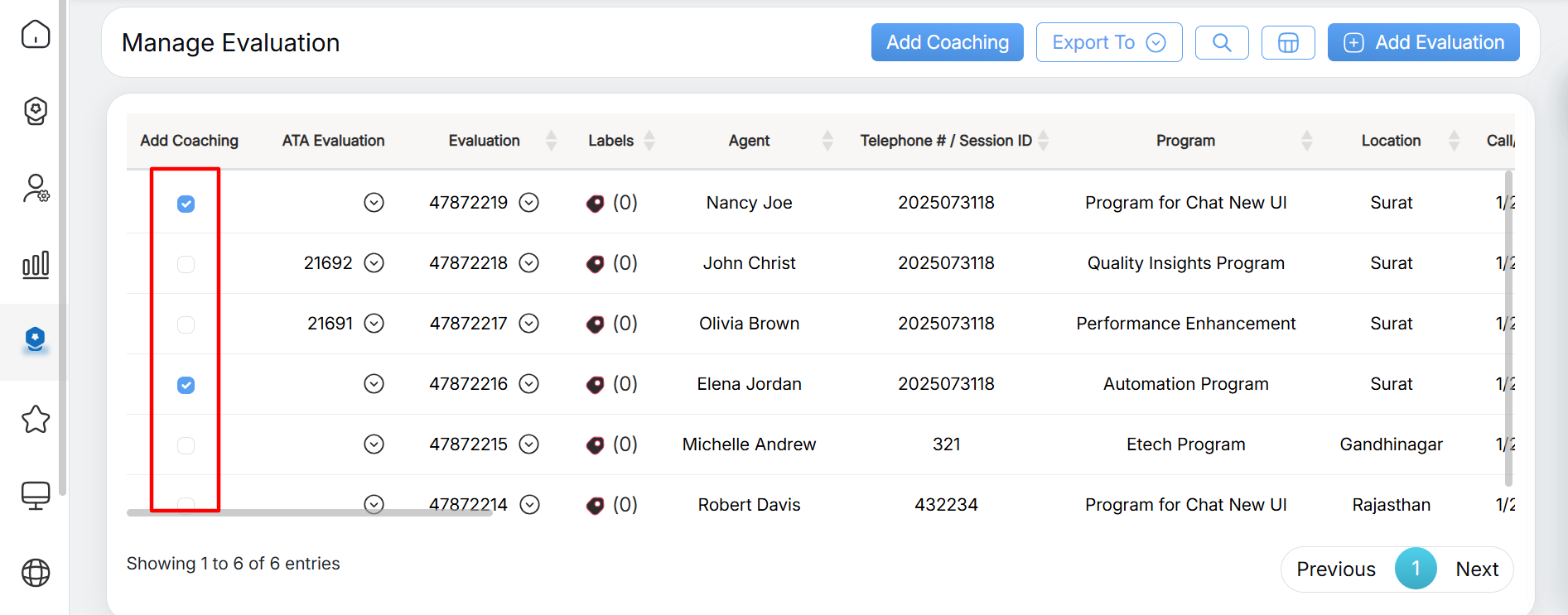 • On the Manage Evaluation page, select one or multiple checkboxes displayed under the Add Coaching column against the evaluations of the same program as shown below: