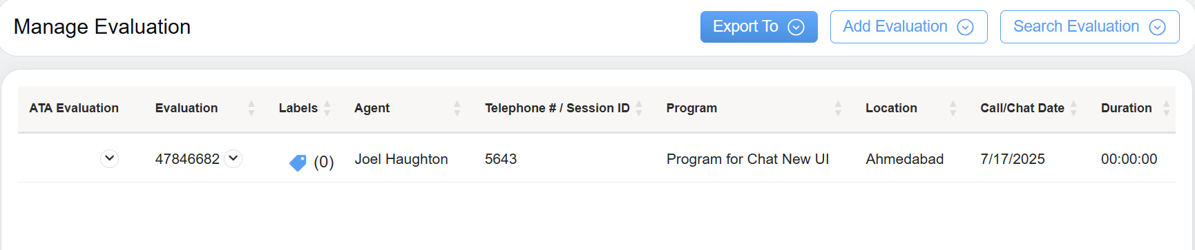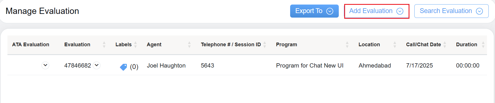 To perform the evaluation process, select Quality > Evaluation/ATA, and the Manage Evaluation screen will be displayed.