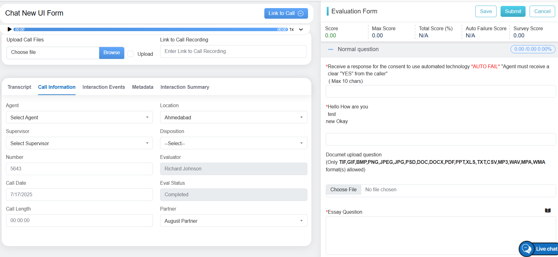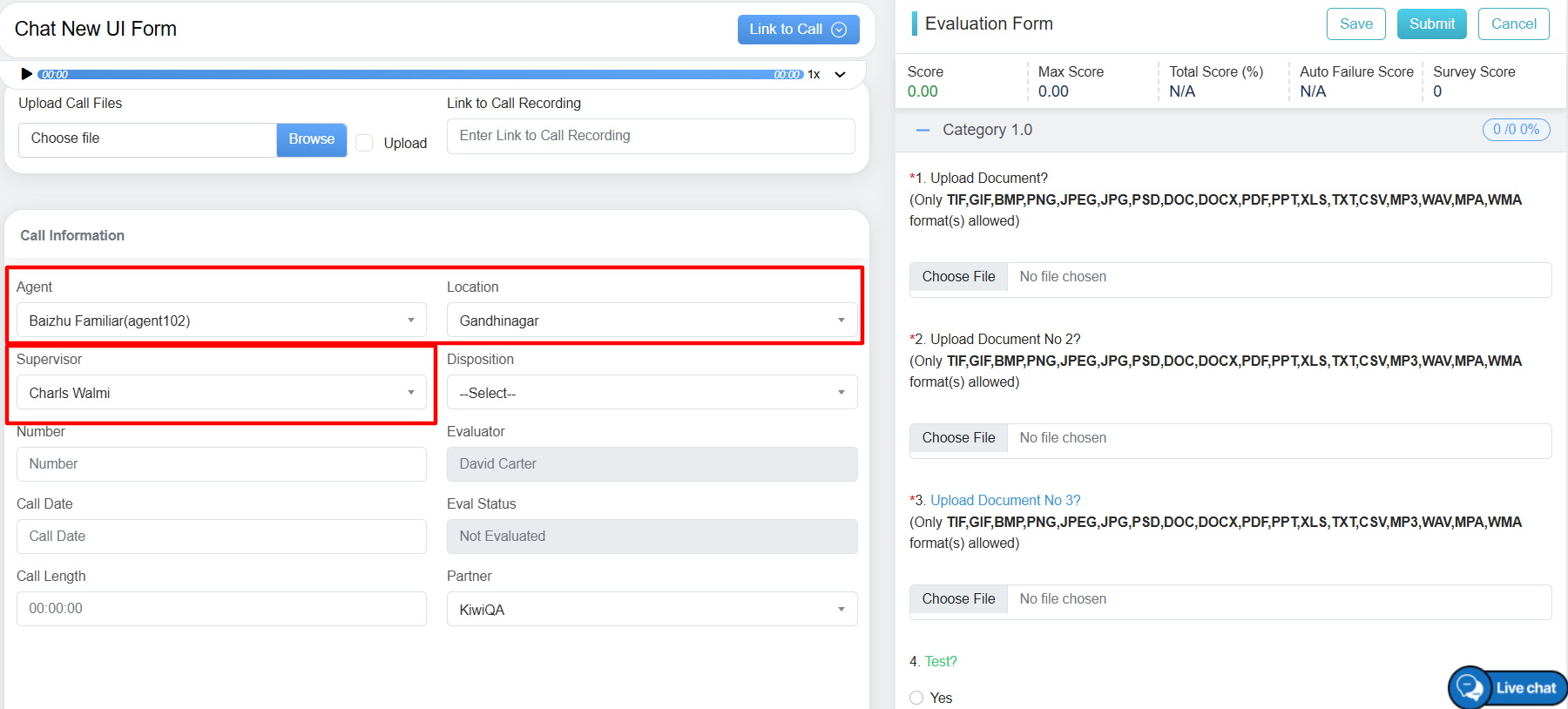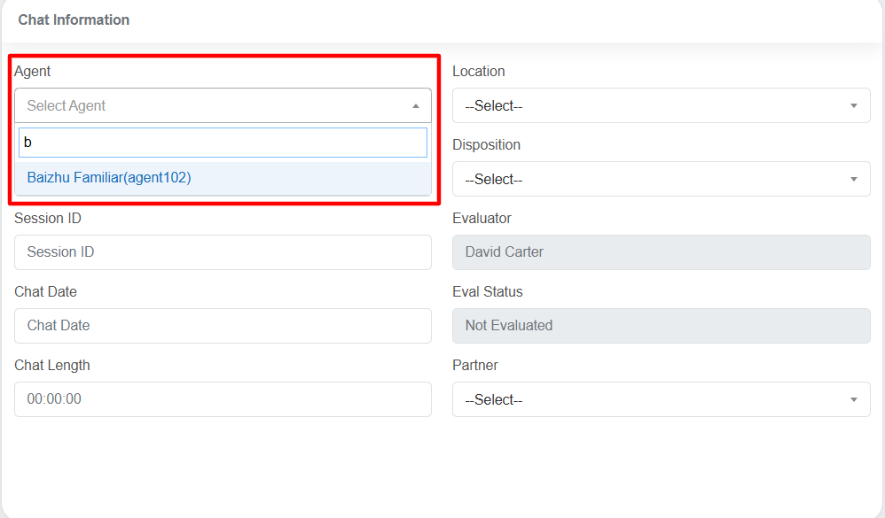 There is a functionality specifically designed to auto-populate the data while an agent’s name is selected on the evaluation screen. However, this functionality can be enabled or disabled by an Admin as per the requirement.