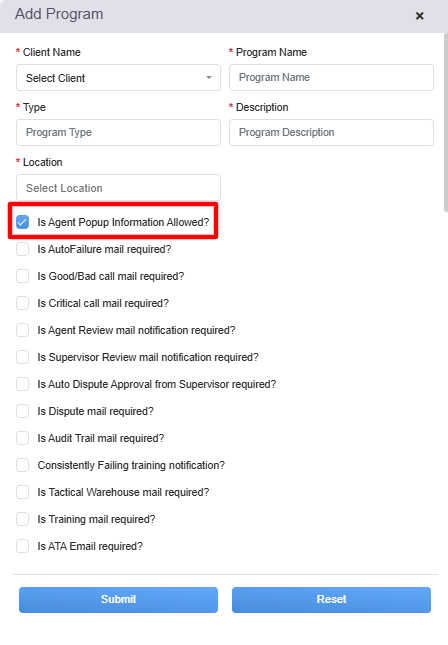 Provide all the necessary details of the new program along with the selection of Is Agent Popup Information Allowed? checkbox to provide access to the auto-population functionality.