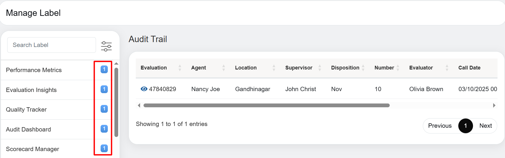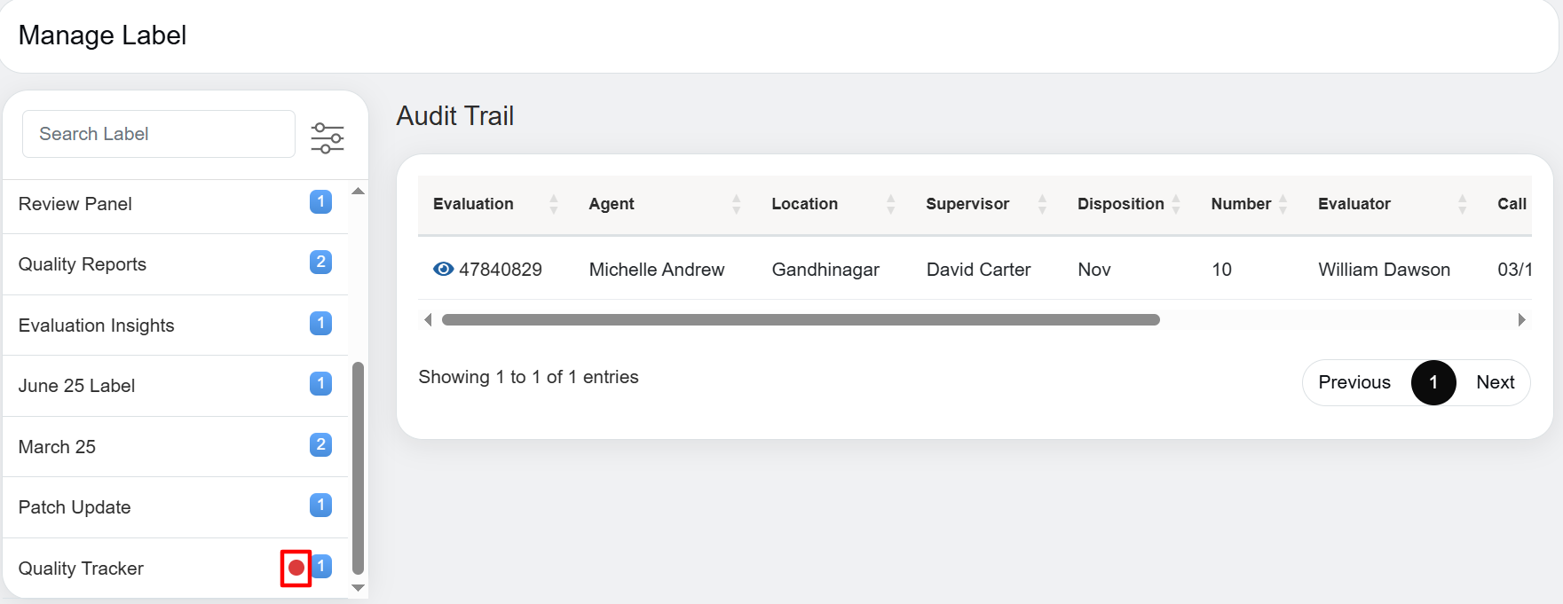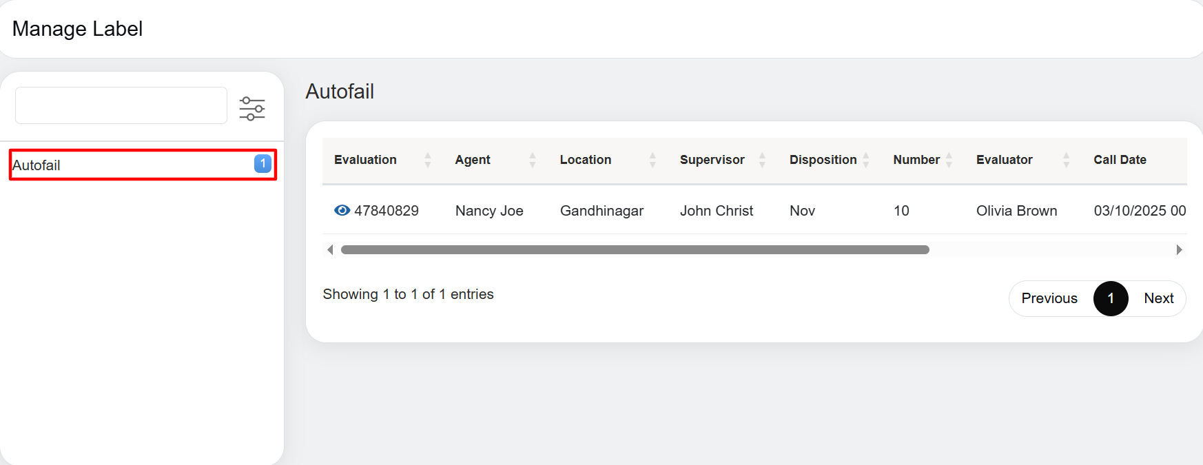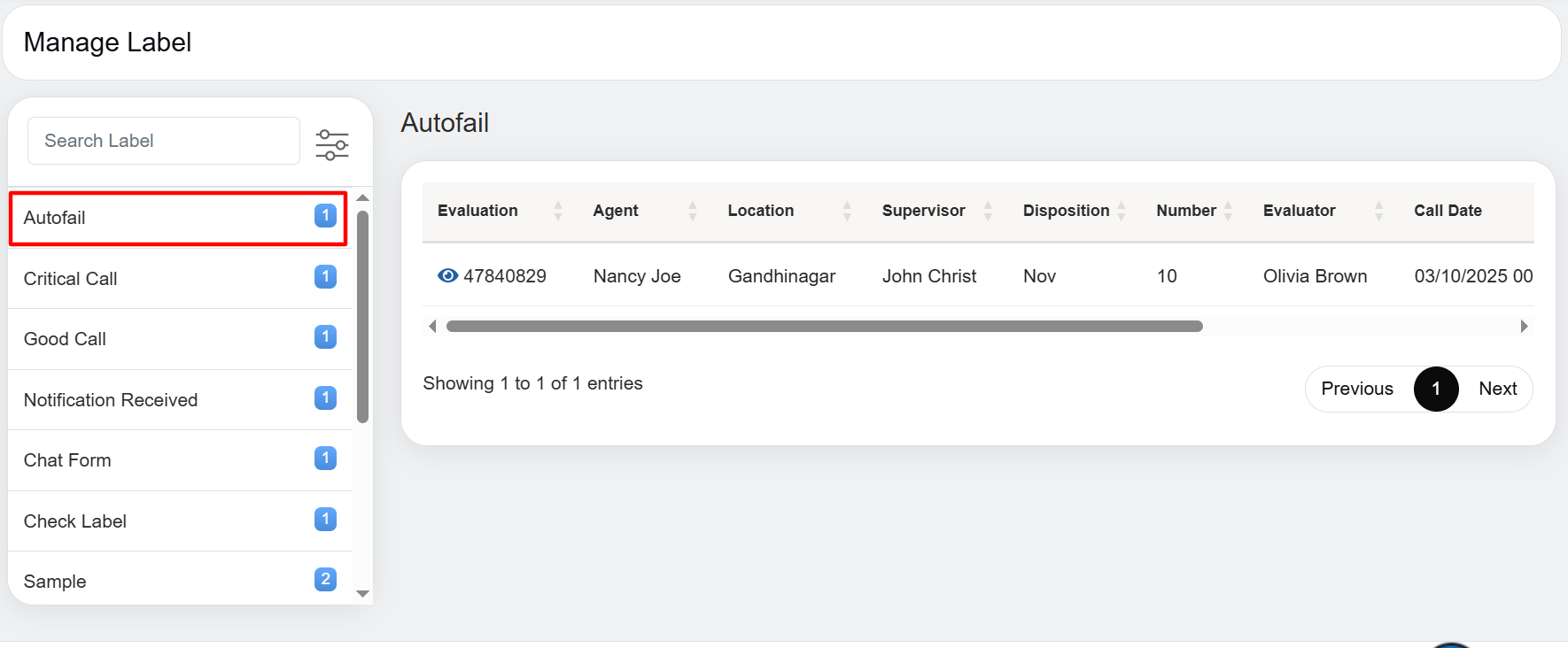 In this, you can see label “Autofail” have been created and under that label, there is “1” number mentioned beside it. Once you click on label, it opens that one evaluation which has been added under that label in the gridview with all the details of the evaluation as shown in above screenshot.