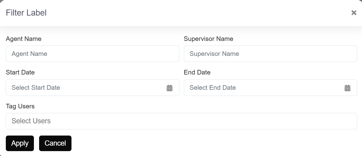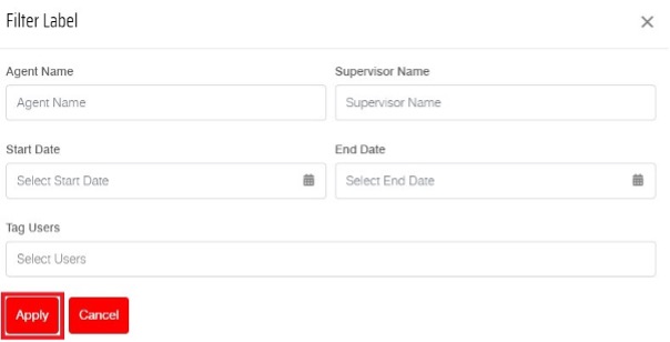 You can filter the label by agent name, supervisor name, start date, end date & tag users. Once any detail has been filled, you can click on “Apply” button or “Cancel” button to discard.