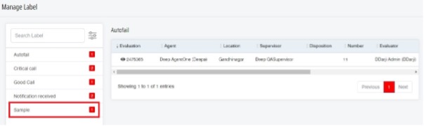 Once the user click on it, the user can see “Autofail” label under “Manage Label” page which is tagged to that user and the evaluation for which it has been added as highlighted in below screenshot:-
