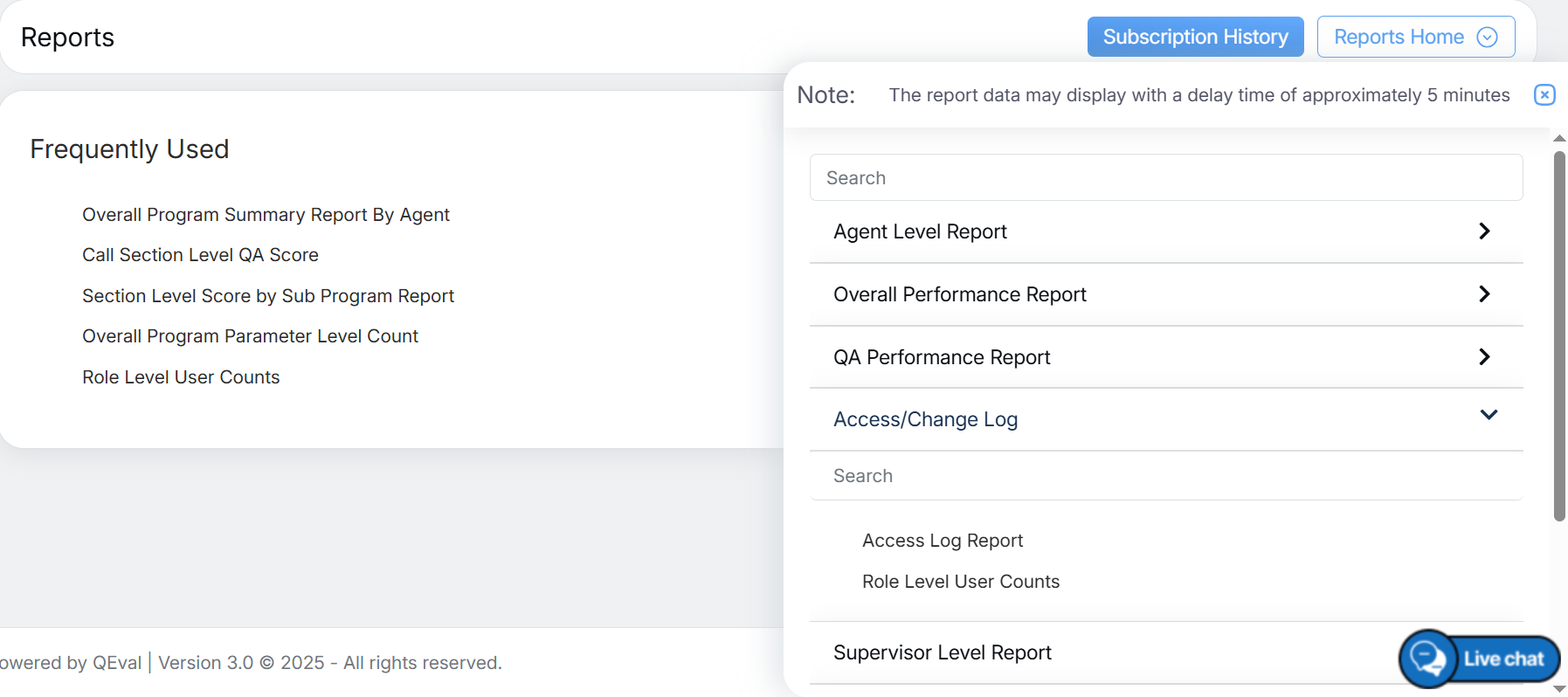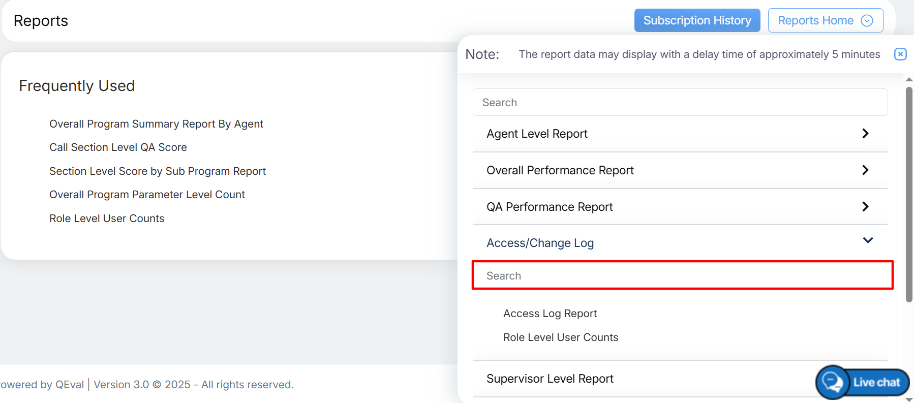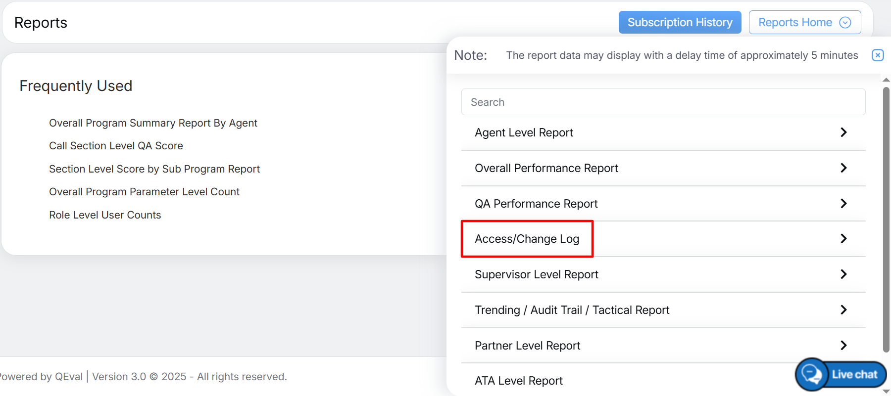 To access these reports, select Reports > Report > Access/Change Log.