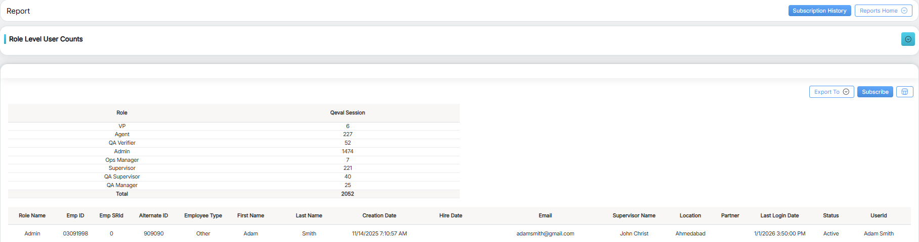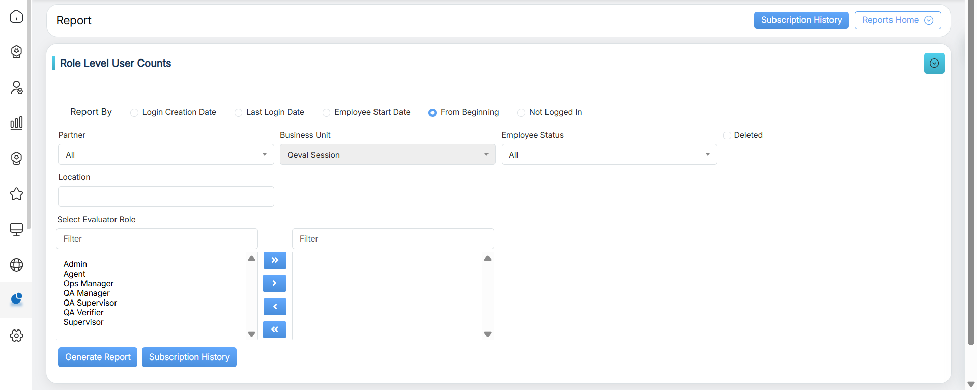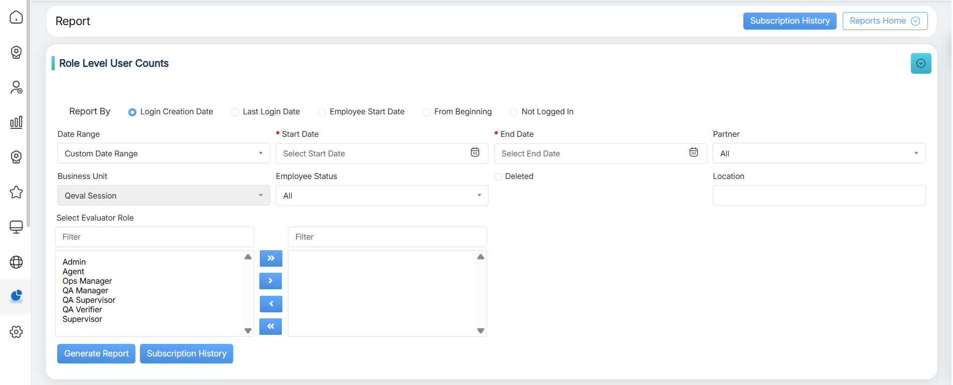 Role Level User Counts Report displays the number of users assigned to User roles in QEval.