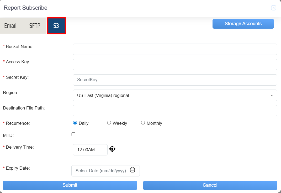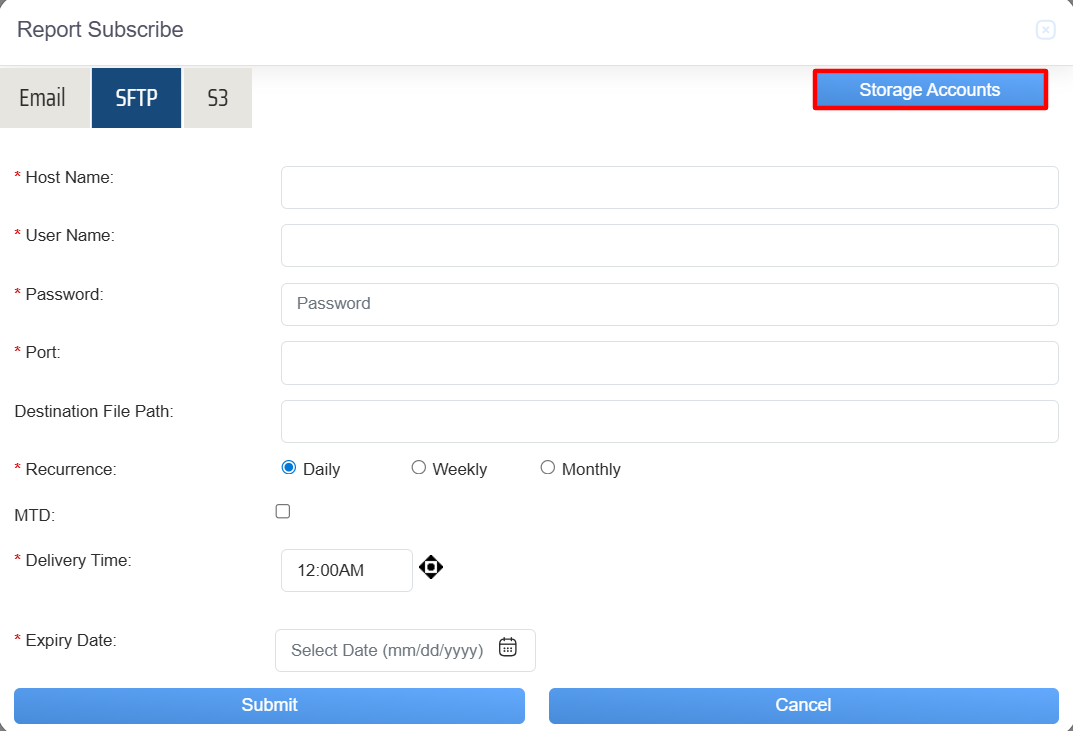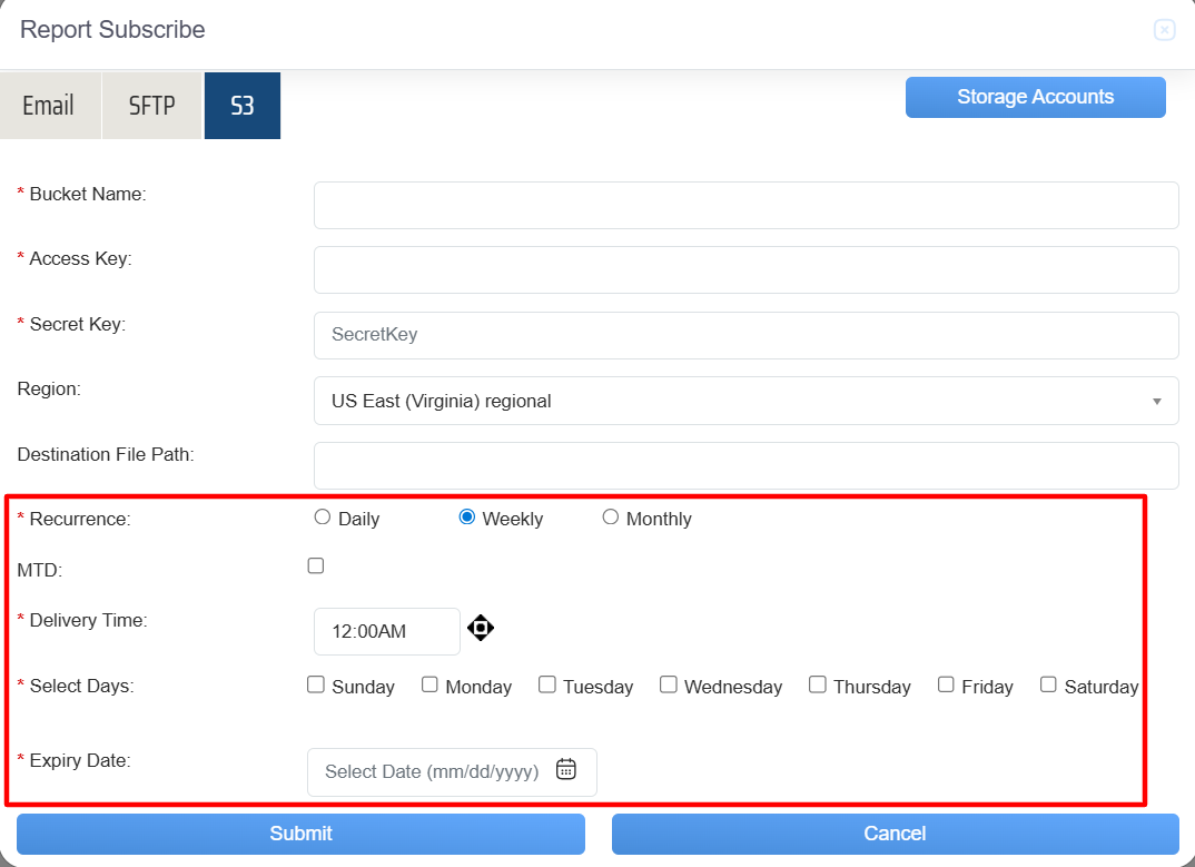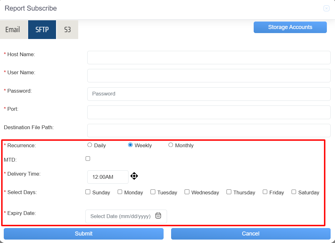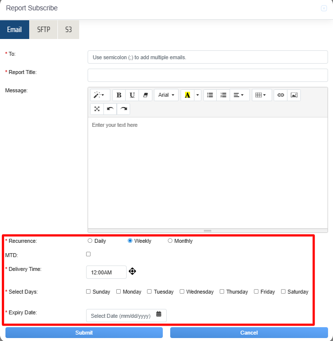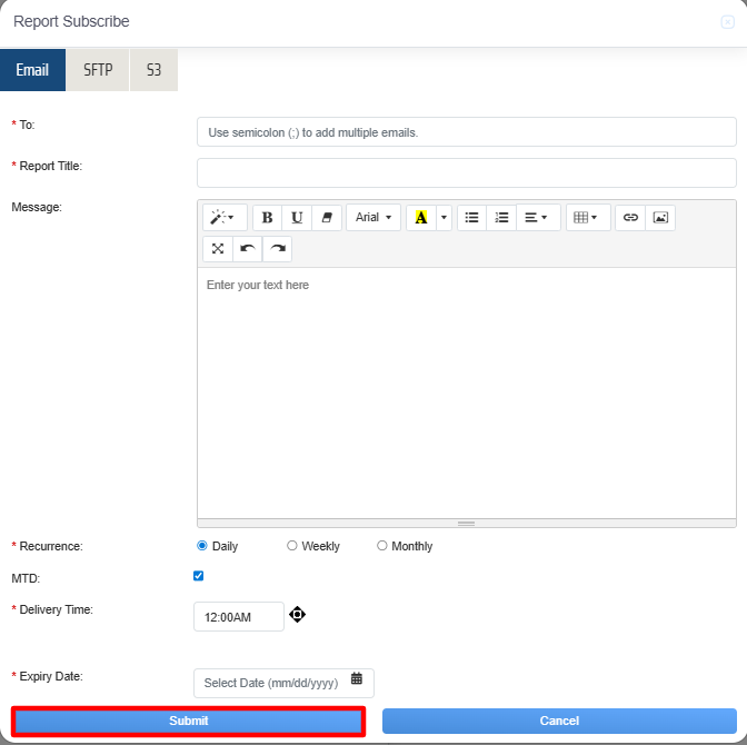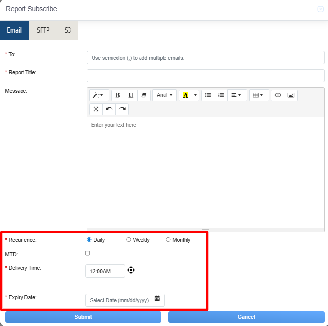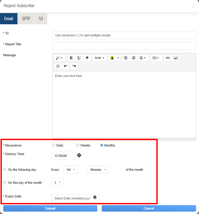 Once the necessary details are configured, click on the Submit button to subscribe the report or click on the Cancel button to discard the process.