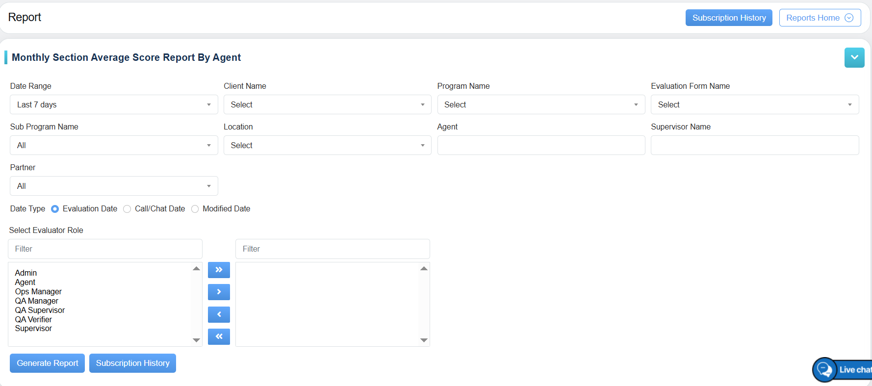 Evaluation Date: Select the radio button to search on basis of the Evaluation date. Call/Chat Date: Select the radio button to search on basis of call/chat date. Modified Date: Select the radio button to search on basis of the evaluation form modified date. |