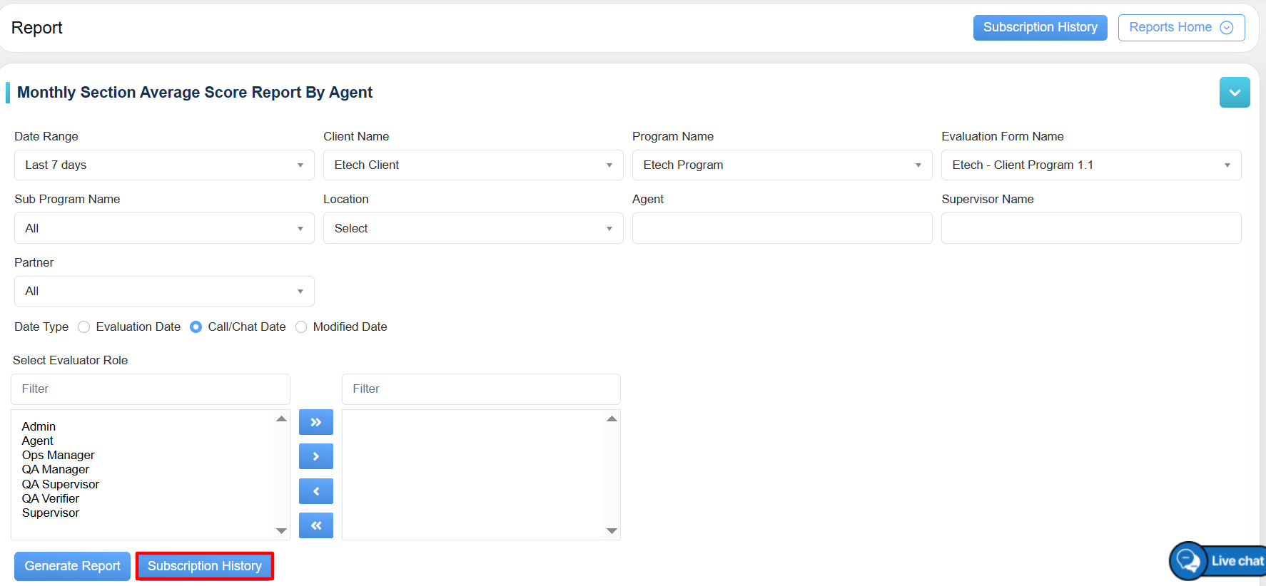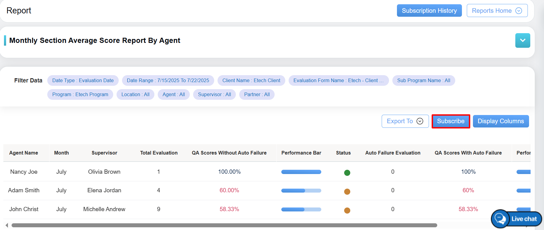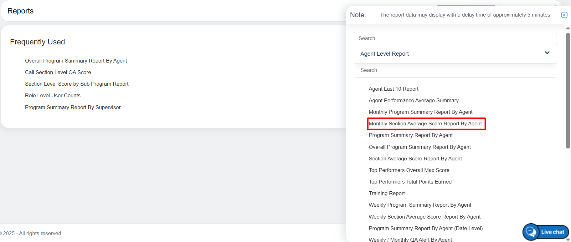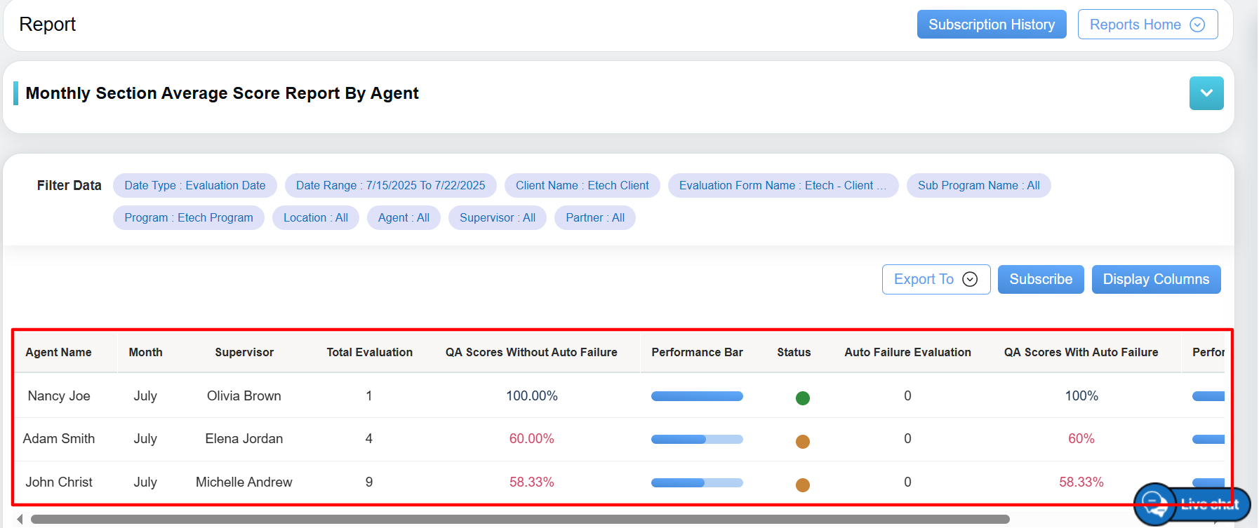 To view this report, select Reports > Report > Agent Level Report > Monthly Section Average Score Report By Agent.
