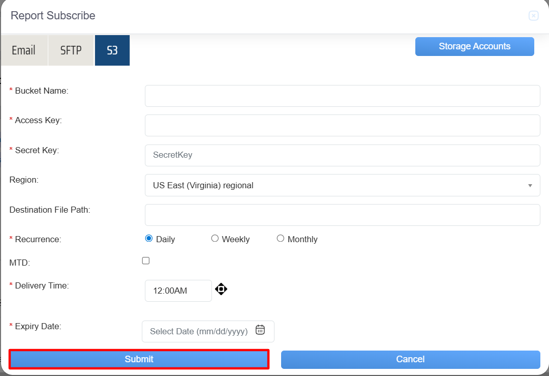 Now, click on “S3” button, from the window of Report Schedule as mentioned in below screenshot: