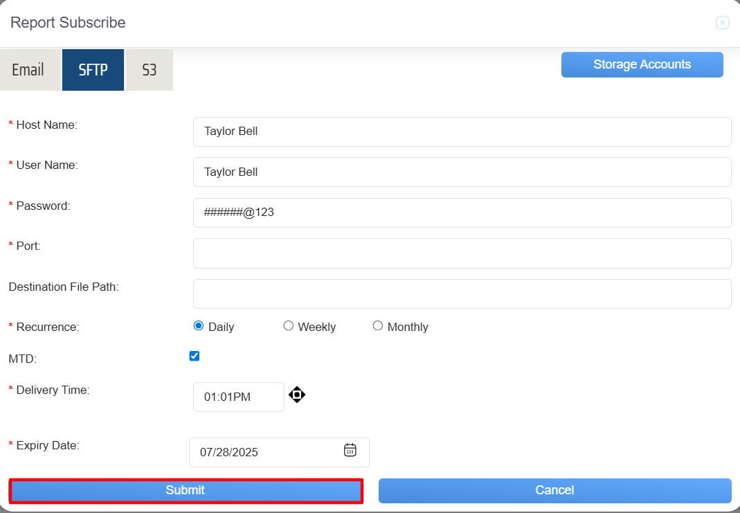 Now, click on “SFTP” button, from the window of Report Schedule as mentioned in below screenshot: