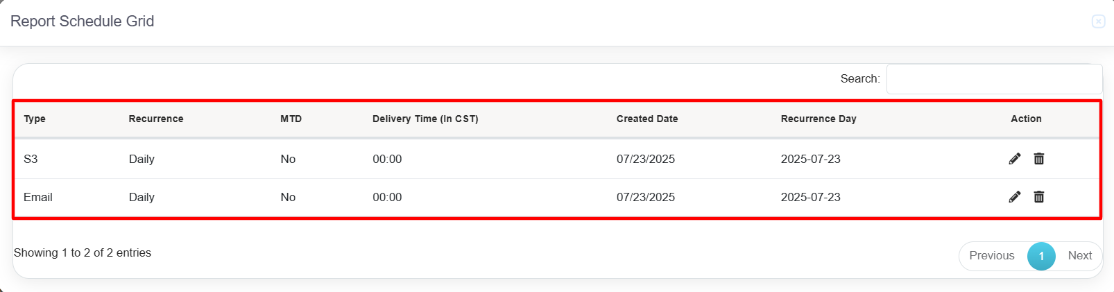 Upon clicking on the Subscription History button, the following Report Schedule Grid pop-up window will be displayed-