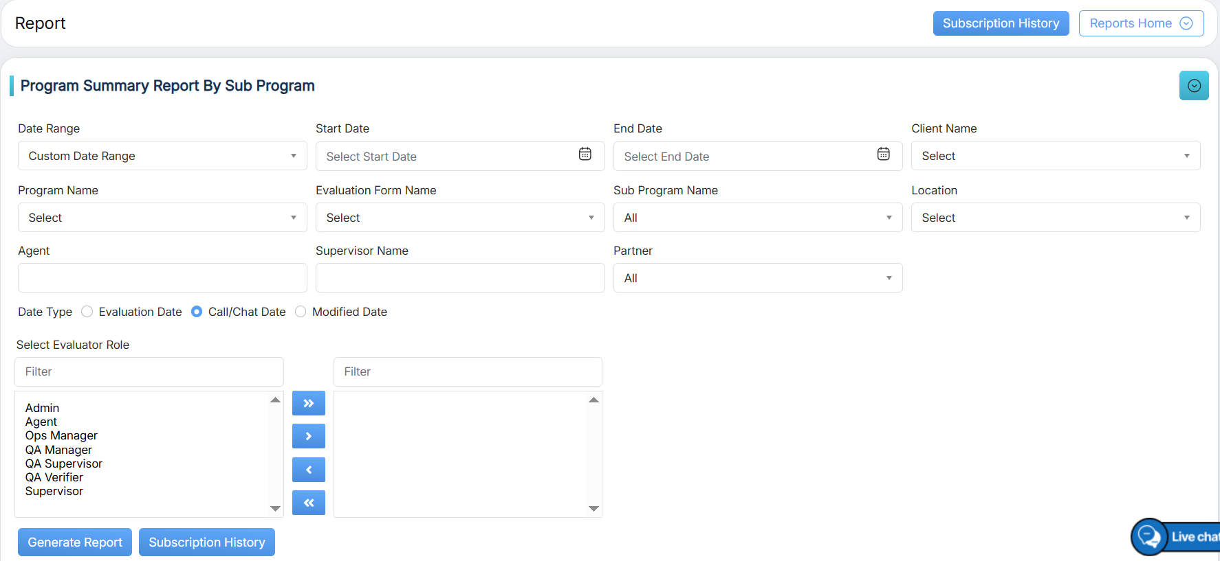 Evaluation Date: Select the radio button to search on the basis of the Evaluation date. Call/Chat Date: Select the radio button to search on the basis of call/chat date. Modified Date: Select the radio button to search on the basis of the evaluation form modified date. |
