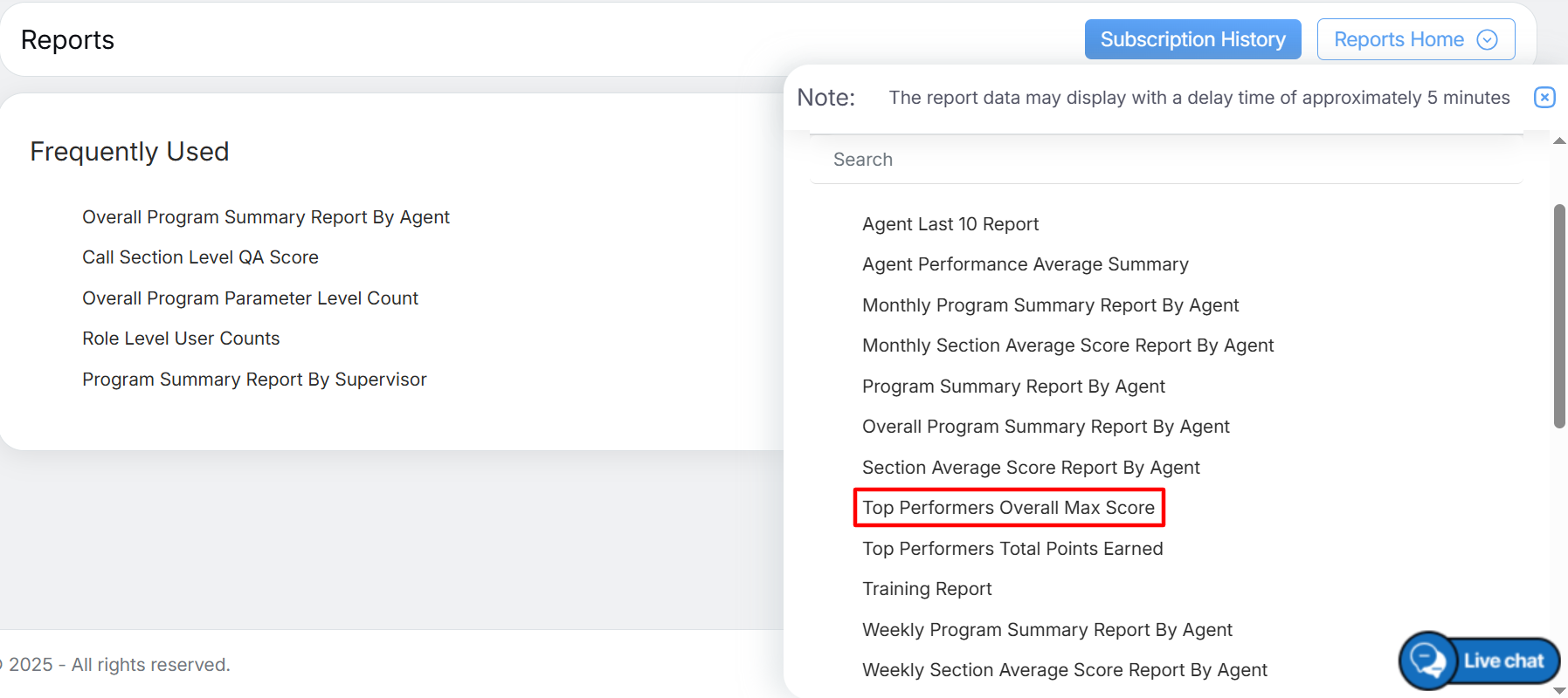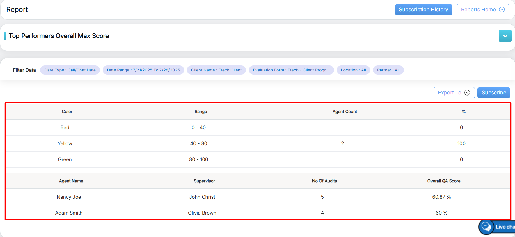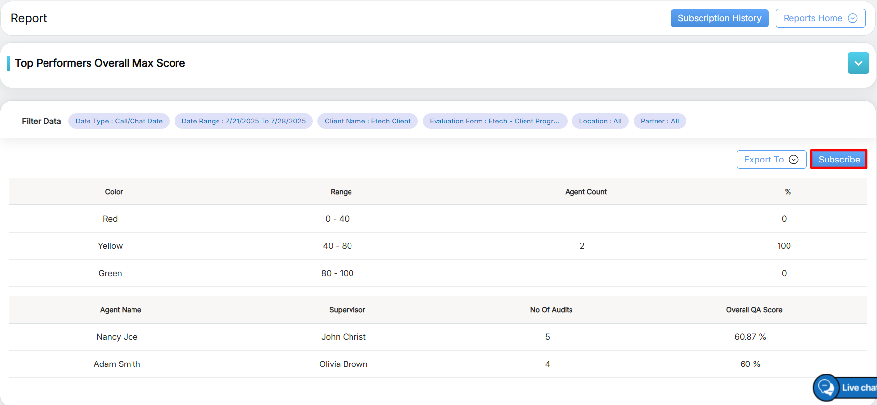To view this report, select Reports > Report > Agent Level Report > Top Performers Overall Max Score.