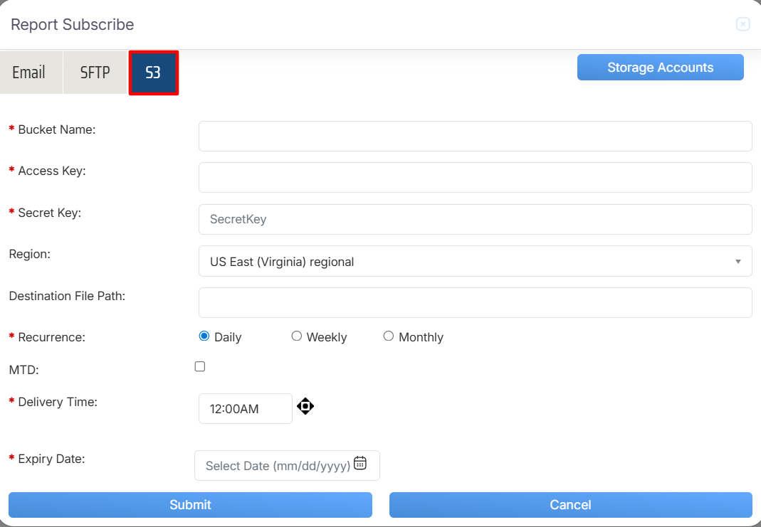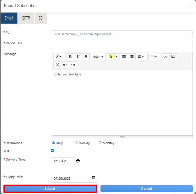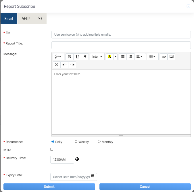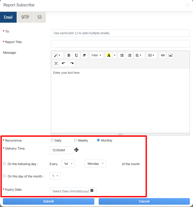 Once the necessary details are configured, click on the Submit button to subscribe the report or click on the Cancel button to discard the process.