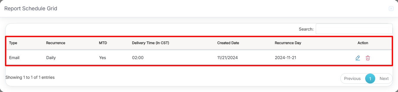 Upon clicking on the Subscription History button, the following Report Schedule Grid pop-up window will be displayed-