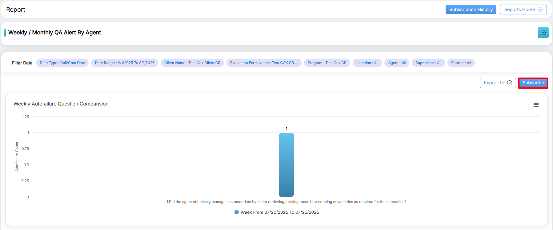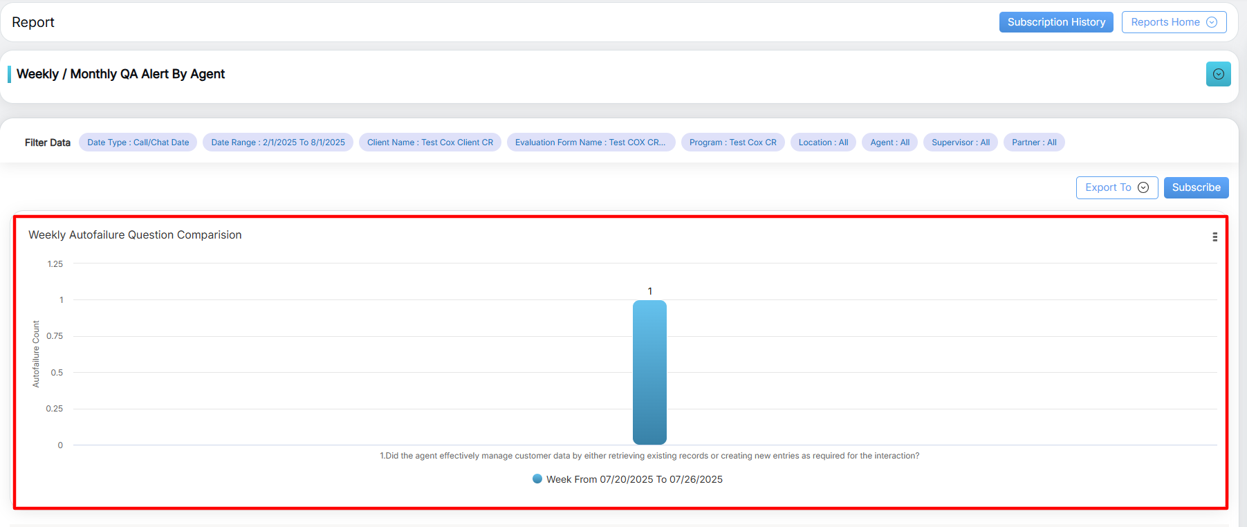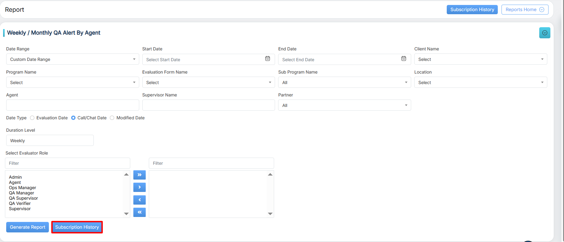 To view this report, select Reports > Report > Agent Level Report > Weekly/Monthly QA Alert by Agent.